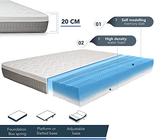 Materasso Memory Matrimoniale 100% Made in Italy - Ortopedico Medio Rigido - Sistema di Alleviamento dei Punti di Pressione - Anallergico, Antibatterico e Antiacaro - Traspirante - MATERASSO ORTOPEDICO. Materasso in memory alto 20 cm, realizzato in polimeri espansi ad acqua, indeformabile e ad alta densità , con portata di 45 Kg / mq e carico ortopedico fino a 230 Kg - Grado di rigidità medio - duro. Le sue sette zone a portanza differenziata hanno un effetto automodellante e garantiscono un riposo comodo e salutare, alleviando mal di schiena, dolori lombari, articolari e sciatalgia. Il materasso e’ utilizzabile da entrambi i lati COMFORT ERGONOMICO. La lastra interna del materasso matrimoniale king memory è formata da due diversi strati di memory e waterfoam compressi insieme. Questi strati sono realizzati in schiuma a celle aperte, che permette un alto grado di ventilazione degli spazi interni, eliminando l'umidità in eccesso e migliorando quindi la qualità del materasso anche nel lungo periodo. L'alta traspirabilità, quindi, assicura un riposo sano anche e soprattutto per chi soffre di reumatismi