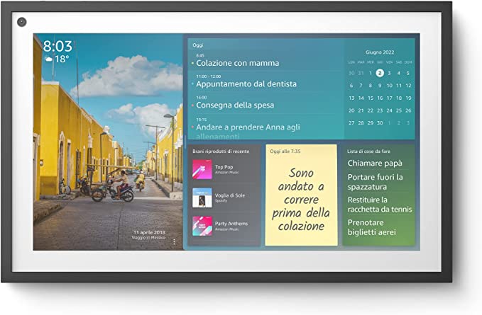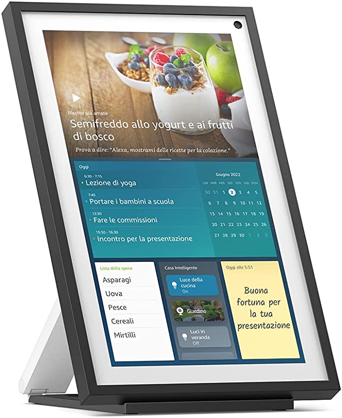 Questo bundle include Amazon Echo Show 15 e un supporto inclinabile - Alexa può mostrarti molto di più – Ottimizza l’organizzazione della tua famiglia e goditi un intrattenimento unico, con lo schermo intelligente da 15,6’’ in qualità Full HD (1080p) e la fotocamera da 5 MP. Puoi posizionare il tuo dispositivo in verticale o in orizzontale. Organizzazione a colpo d’occhio – Usa i widget di Alexa per migliorare l’organizzazione della tua famiglia con calendari, note personali, liste della spesa, liste di cose da fare e promemoria.-Alexa ti aiuta anche in cucina – Scopri ogni giorno nuove ricette o aggiungi gli ingredienti alla tua lista della spesa. Tieni tutto sotto controllo – Con la finestra picture-in-picture puoi visualizzare i video dalle telecamere compatibili anche quando stai facendo altro. Ad esempio, puoi controllare la telecamera della porta d'ingresso mentre guardi un notiziario. Accessorio progettato appositamente per il dispositivo Amazon Echo Show 15. Il dispositivo può essere inclinato fino a 27 gradi in verticale e fino a 30 gradi in orizzontale. Supporto stabile con piedini antiscivolo, per evitare che il dispositivo possa cadere. Con sistema per nascondere il cavo in eccesso.