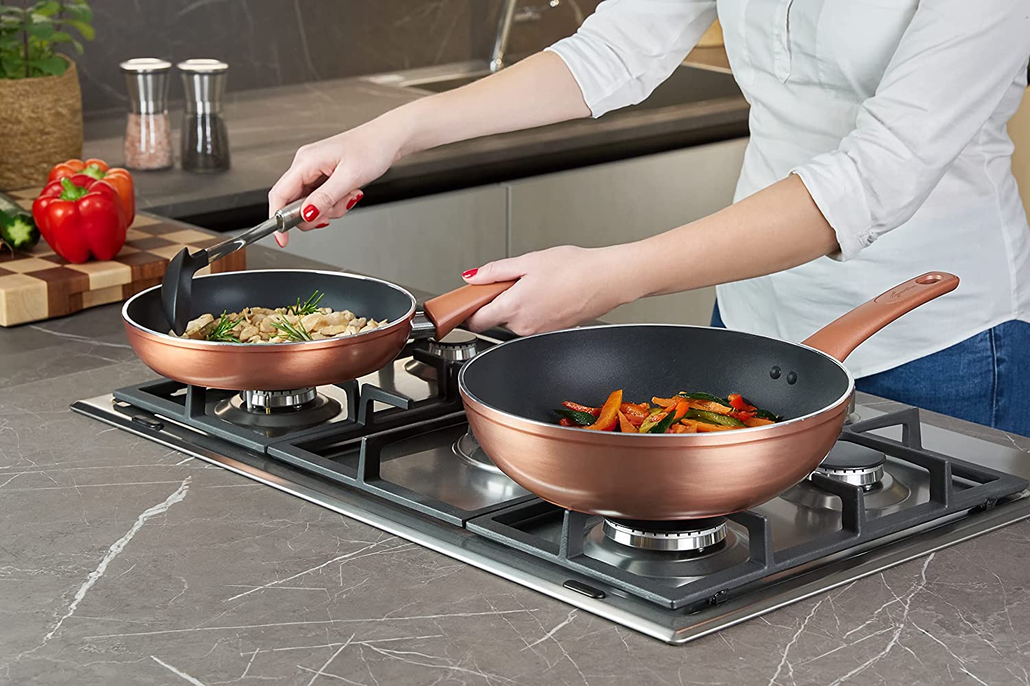Lagostina Ramata - Set di Pentole e Padelle Antiaderenti in Alluminio per Gas e Forno 8 Pezzi, Esterno Effetto Rame, Indicatore Cottura Thermo-Signal, con 2 Casseruole, 2 Padelle, Tegame, 3 Coperchi - SET PENTOLE: Batteria di pentole Lagostina 8 pezzi composta da: casseruola manico lungo 14 cm, padella 24 e 28 cm, tegame 24 cm, casseruola a due maniglie 20 cm, coperchio in vetro 14, 20 e 24 cm - BATTERIA PENTOLE IN ALLUMINIO: Il set di pentole Ramata è realizzato è realizzato in alluminio con elegante rivestimento esterno ad effetto rame lucidato; facili da pulire, lavabili in lavastoviglie. Garantite 2 anni - INDICATORE DI CALORE: L'indicatore Thermo-Signal al centro della padella e del tegame cambia colore quando si è raggiunta la temperatura giusta per iniziare la cottura, per ricette cotte sempre a puntino - RIVESTIMENTO RINFORZATO: Il rivestimento interno antiaderente Titanium Easy extra resistente è rinforzato con particelle di Titanio per una maggiore resistenza ai graffi e alle abrasioni; senza PFOA, cadmio e piombo - PER GAS E FORNO: Il fondo ad alto spessore in alluminio tornito e antiscivolo è adatto a tutti i piani di cottura, induzione esclusa, e al forno fino a 175° C; è facile da pulire e non fa attaccare i cibi - MANICO ERGONOMICO: Realizzato in Bakelite per assicurare una presa comoda e sicura; è dotato di un pratico foro in fondo al manico per appendere la padella - LINEA RAMATA: Ramata è la linea di pentole Lagostina antiaderenti dedicata a un utilizzo quotidiano; contraddistinta dal brillante corpo con rivestimento ad effetto rame lucidato, è una linea elegante pensata per essere esposta in cucina
