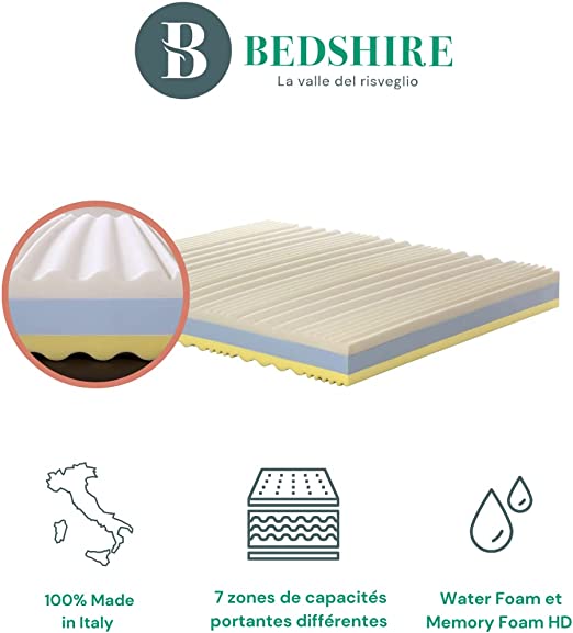 Bedshire Essential - Materasso Singolo 80x190 in Memory Foam Ortopedico 23 cm, Fodera Cotone e Tessuto Traspirante, Made in Italy 100% - Taglia 80x190 - Ipoallergenico - Mediamente rigido - Materiale di riempimento Memory foam Dimensioni 190L x 80l x 23Sp cm - L’interno del Bedshire Essntial è realizzato in Memory Foam HD una speciale schiuma creata appositamente per i nostri modelli ha una densità molto elevata che da la sensazione di dormire su una nuvola - La parte superiore dell’interno è realizzato con effetto massaggiante che grazie alla sua speciale forma dona una piacevole sensazione di comfort durante tutto il sonno rafforzando ancora di più i benefici a livello ortopedico - Il rivestimento del materasso Essential è realizzato in cotone 100% traspirante e soffice al tatto nella parte superiore, mentre la parte inferiore è in tessuto traspirante che lo rende ancora più fresco durante il sonno. Il prodotto è Made in Italy 100% e certificato Oeko Tex Standard 100 e ISO 9000. 10 anni di garanzia