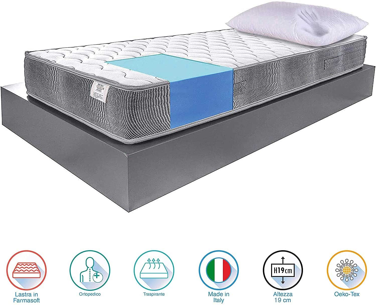 Farmarelax, Kit materasso singolo,h19 cm, più cuscino memory in regalo, guanciale in omaggio, antibatterico, imbottitura in fibra ipoallergenica. Rivestimento in misto cotone ipoallergenico e traspirante, in grado di combattere la formazione di batteri e garantire l’igiene e la traspirabilità del materasso. Comode Maniglie resistenti solleva materasso.