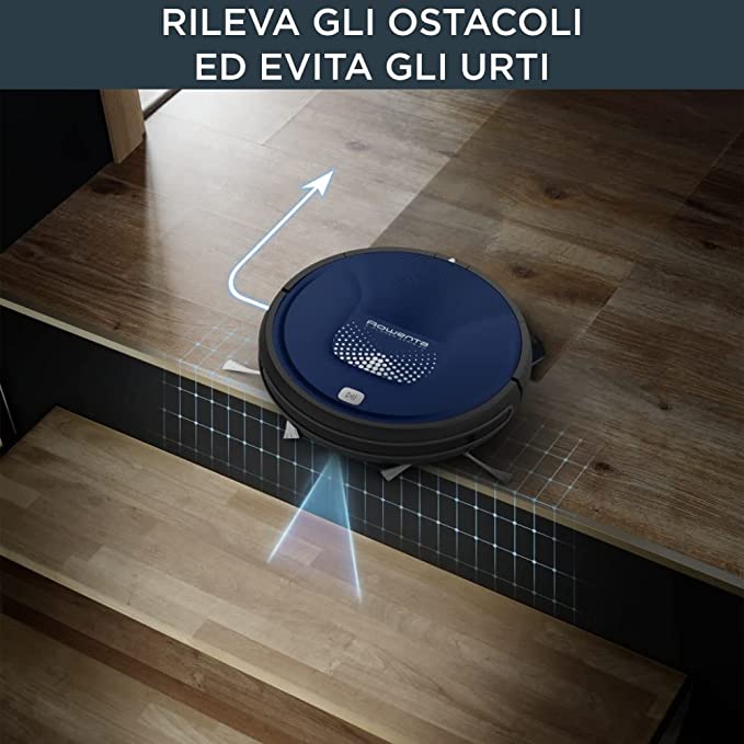 Rowenta RR6871 X-Plorer Serie 20 - Robot Aspirapolvere Lavapavimenti, Aspira e Lava in una Passata, Autonomia 2 Ore e 30 Min, 3 Modalità di Pulizia, Programmabile, con Telecomando - Marchio Rowenta - Colore Nero, Blu - Dimensioni 32.5L x 8l x 32.5H cm - Con il robot aspirapolvere Rowenta X-Plorer Serie 20 puoi aspirare e lavare tutti i tipi di pavimenti senza fatica; è dotato di sensori ad infrarossi, paraurti e anticaduta, per riconoscere ed evitare gli ostacoli - Grazie al sistema Aqua Force e al panno in microfibra il robot aspira e lava in una sola passata; la spazzola motorizzata e le spazzoline laterali catturano ogni tipo di sporco, per una pulizia efficace anche negli angoli - La batteria agli ioni di litio ad elevate prestazioni offre fino a 2 ore e 30 minuti di autonomia, permettendo all'aspirapolvere robot Rowenta di pulire tutta la casa con una sola carica - Scegli tra le 3 modalità di lavoro in base alle tue esigenze: Random, per le aree più grandi; Randoom Room, per una sessione di pulizia più rapida da 30 minuti; Edge, per pulire lungo le pareti e i battiscopa - Il sistema di impostazione prevede fino a 7 programmi che possono essere utilizzati ogni giorno della settimana, per una casa senza tracce di polvere - Il telecomando con display è pratico e facile da usare; permette di controllare l'aspirapolvere robot a distanza grazie ai 2 sistemi di comando: avvio/arresto dell'apparecchio - Per ricaricare il robot, accenderlo tenendo premuto il pulsante di accensione/spegnimento per 3 secondi. Collegare il robot alla base di ricarica: le piastre di ricarica sul robot devono toccare quelle sulla base di ricarica.