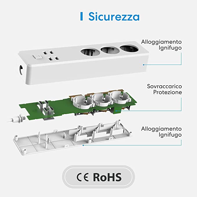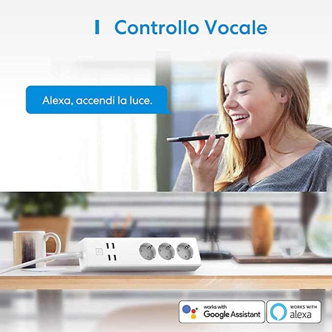Ciabatta Intelligente Multipresa Wifi Smart 3 Prese AC - 4 Porte USB, Funzione Timer - Protezione da Sovraccarico 10A, Compatibile con SmartThings, Amazon Alexa, Google Assistant. - App Controllo Remoto: questa presa multipla intelligente ha la protezione di sovratensione, ti offre più sicurezza. Con 3 smart AC e 4 porte usb, ideale per l’uso domestico e all’ufficio. Puoi accendere o spegnere ogni uscita AC e 4 porte usb in qualsiasi posti (4 porte USB non possono essere controllate separatamante) - Controllo Vocale: compatibile con Amazon Alexa, google home, supporto il controllo vocale. Puoi attivare / disattivare un elettrodomestico con il comando vocale tramite Echo o Google Home. Funzione Timer: crea e imposta programmazioni on / off e una routine di timer di spegnimento automatico per ogni presa e quattro porte USB per funzionare automaticamente. Affinché i tuoi dispositivi possano accendersi e spegnersi da soli. Alba / Tramonto è pronto. La funzione Random On / Off verrà aggiunta presto tramite l'aggiornamento del firmware. Installazione Semplice e Intuitiva: basta scaricare la nostra applicazione e seguire i passaggi d'installazione per iniziare. Il design dell'app è semplice e intuitivo e la connessione Wi-Fi è molto stabile. Qualità Eccellente: la ciabatta intelligente è realizzata in materiale PC ignifugo ed è stata approvata per la sicurezza e l'alta qualità.