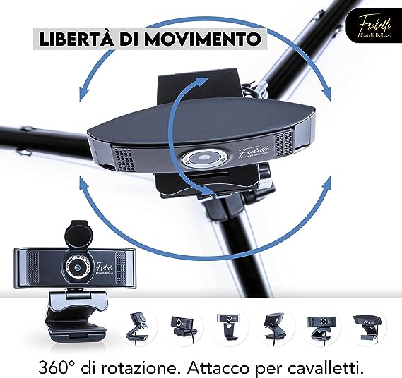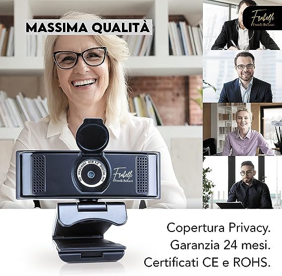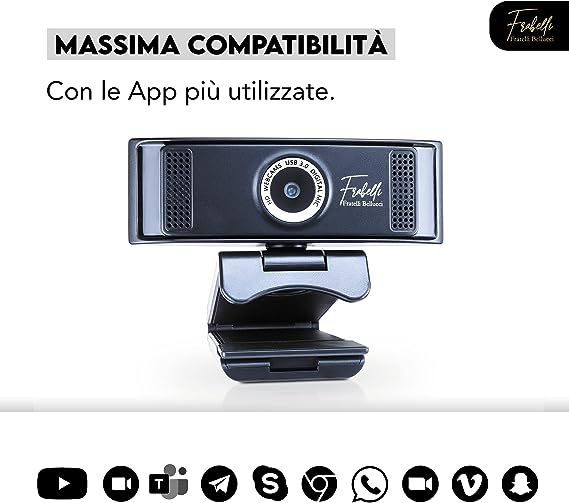 La webcam Frabelli è un prodotto professionale dotato di 2 microfoni integrati e di una telecamera ruotabile in alta risoluzione con cui otterrai immagini nitide e definite. La webcam è pratica e leggera ed è ideale sia per il tuo computer fisso sia portatile per streaming, videoconferenza, insegnamento online. Fratelli Bellucci, garanzia di qualità! La webcam plug and play ha una risoluzione reale di 1920*1080p e possiede un microfono digitale integrato con un audio hd chiaro e cristallino. La visualizzazione ideale è da una distanza di 0,5-1,5 metri, la messa a fuoco è fissa e l’angolo dell'obiettivo è di 65 gradi. Il prodotto è ruotabile a 360 ° mentre la regolazione su e giù è di 90°. - La webcam è dotata di una porta usb 3.0 con lunghezza del cavo di 150 cm che include un anello magnetico per la riduzione del rumore. La nostra webcam è dotata di una cover copri fotocamera, garantendoti la privacy. Con il prodotto è incluso un pratico manuale di istruzioni in italiano. Il prodotto è certificato e approvato CE e ROHS. La Webcan Frabelli è compatibile con più sistemi operativi: Mac OS 10.5, Android 5.0 e versioni successive, Windows 7/8/10, Linux 2.6 24 e Ubuntu V10.04. Inoltre, la videocamera funziona con Neetmeeting, Facebook live, Youtube, Skype, Xbox live, Xsplit, Mixer, Mcap ecc. Il prodotto è facile da installare