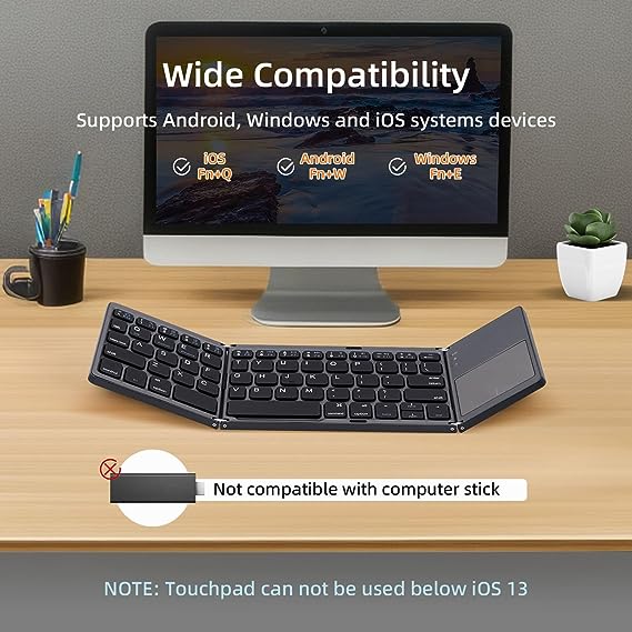 Tastiera wireless di dimensioni palmari supporta i dispositivi Bluetooth (iOS, Android e Windows). Il nuovo aggiornamento Bluetooth 5.0, mantiene una connessione stabile e fornisce una risposta rapida al dispositivo entro 10 metri. Basta accendere la tastiera per connettersi automaticamente all'ultimo dispositivo collegato. Il design simile alle dimensioni standard consente una digitazione precisa e veloce, proprio come la tastiera da tavolo a cui siete abituati. I tasti silenziosi consentono inoltre di concentrarsi sul lavoro. Dotato di un touchpad di nuova concezione, aggiunge una funzione di pressione che rende il touchpad più simile a un computer portatile. È possibile controllare il dispositivo senza mouse. Toccare due volte e tenere premuta la tastiera per trascinare un file. (La funzione touchpad di B033 Plus è compatibile con iOS). Batteria ricaricabile a basso consumo incorporata con tempo di ricarica di 2-3 ore e tempo di standby di circa 560 ore. Inoltre, è stato sostituito con un più comodo ingresso di tipo C. Una carica completa è sufficiente per un breve viaggio di lavoro o una vacanza. Le dimensioni ripiegate sono di circa 15 x 9,7 x 1,3 cm. Compatto e leggero. Facile da trasportare. Perfetto per viaggi d'affari, viaggi e mostre!