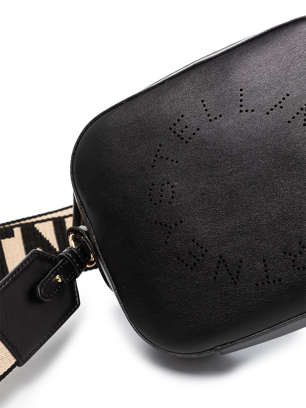 Stella McCartney - Borsa a tracolla con logo Stella mini. Caratteristiche: nero, dettaglio con logo traforato, tracolla regolabile e rimovibile, dettagli color oro, chiusura superiore con zip, tasca interna applicata - POSITIVELY CONSCIOUS: Stella collabora con Good On You, un'agenzia etica che utilizza vari criteri per valutare quanto un brand sia sostenibile per comunità , pianeta e protezione degli animali. Questo prodotto proviene da un brand Conscious che ha una buona performance dal punto di vista dell'impatto sugli animali Composizione: Fodera: Poliammide 50%, Poliuretano 50% - Esterno: Poliuretano 56%, Poliestere 44%