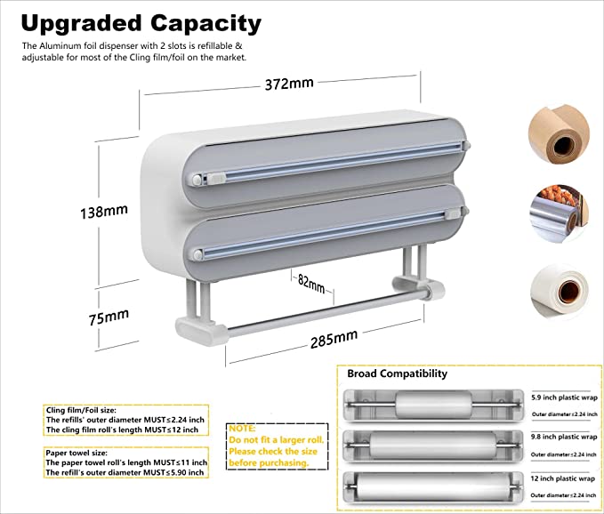 Dispenser e taglierina magnetica per film - Supporto per rotolo da cucina 3 in 1 montato a parete, Dispenser carta stagnola in alluminio con supporto per asciugamani carta. Supporto per rotolo di carta da cucina + Dispenser e taglierina per pellicola trasparente e stagnola, il design all-in-one consente di inserire carta oleata, stagnola e un rotolo di carta assorbente - DESIGN MAGNETICO: il fondo del dispenser di fogli e pellicole è dotato di un potente magnete che lo fa aderire facilmente alle superfici metalliche come i frigoriferi. Viene fornito con 2 ganci sul retro, in modo da poterlo appendere in qualsiasi punto della parete o del piano di lavoro, per confezionare gli alimenti in modo rapido e semplice - un pratico salvaspazio in cucina. TAGLIERINA A SCORRIMENTO DI SICUREZZA: la taglierina per pellicole aderenti è dotata di 2 lame a scorrimento nascoste e bidirezionali, affilate e resistenti. Funzionamento sicuro . L'involucro di plastica esce in modo uniforme e si taglia in modo rapido e ordinato