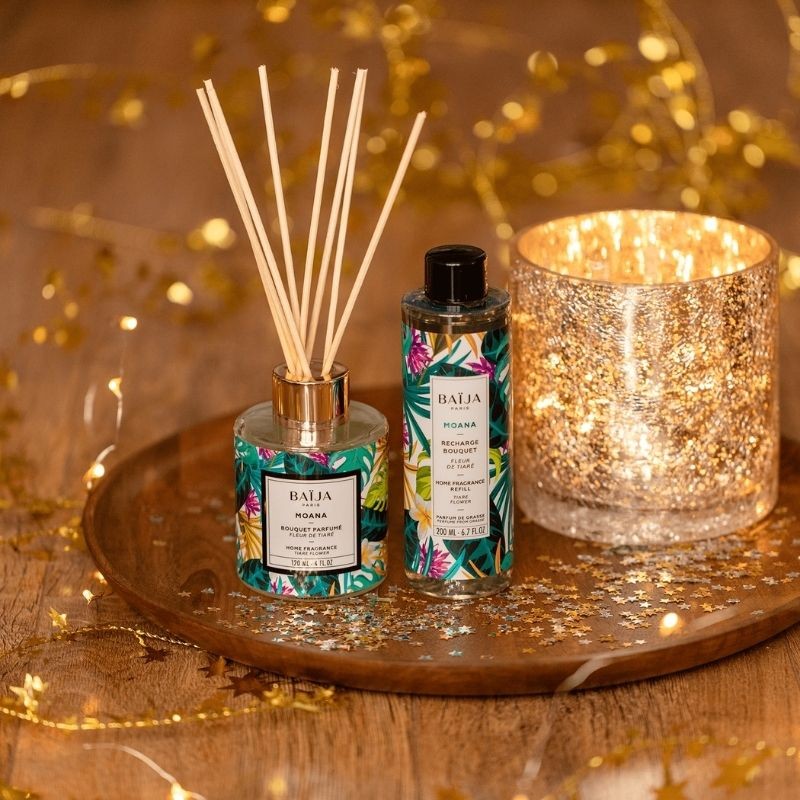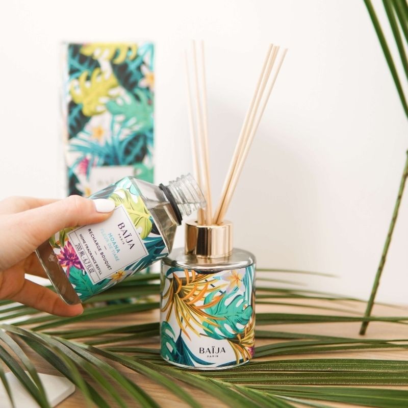 BAIJA - HOME FRAGRANCE BOUQUET. FRAGRANZA PER AMBIENTI: fragranza esclusiva creata per Baija dai migliori maestri profumieri di Grasse. Fiore di tiaré, note di noce di cocco e di tuberosa regalano agli ambienti domestici atmosfere olfattive fruttate e floreali dal sapore inconfondibilmente esotico. Fragranza: Fior Di Tiarè - Quantità: 120 ml - Fragranza elaborata da un maestro profumiere di Grasse. Rimuovere il tappo protettivo, inserire i bastoncini di rattan nel bouquet. La fragranza si diffonderà immediatamente nell’ambiente. Trattare con cautela, non ingerire, tenere lontano dagli occhi, non respirare direttamente dalla boccetta, tenere fuori dalla portata dei bambini.