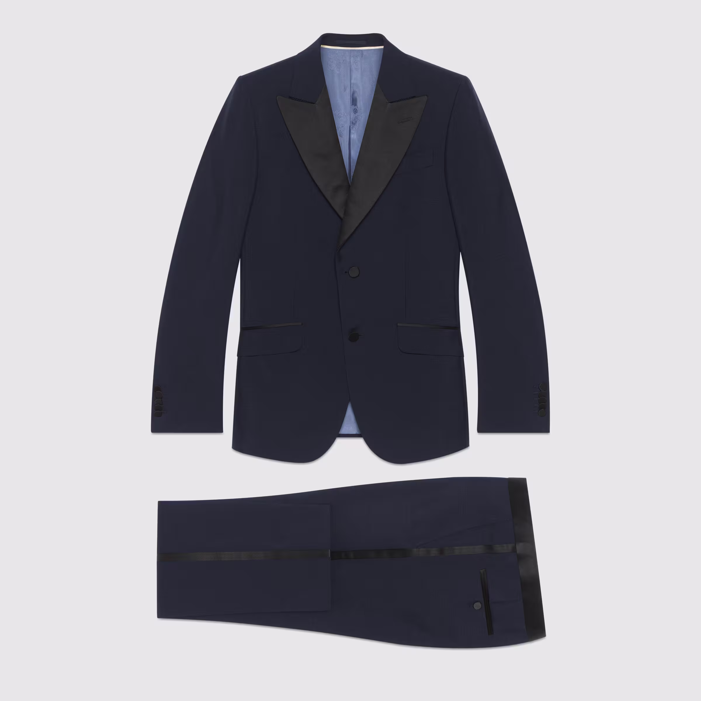 GUCCI: Smoking aderente in lana mohair. Uno smoking in lana mohair con dettagli a contrasto in satin. Tra le linee di tailoring essenziali della Maison, l'abito comprende una giacca dal taglio aderente e pantaloni alla caviglia. Design ed elementi sartoriali classici sono reimmaginati in nuovi modi ogni stagione. Lana mohair blu scuro - Finitura in satin - Giacca con mezza lavorazione in tessuto, chiusura a due bottoni, revers a lancia e tasche frontali con pattina Pantalone con tasche frontali all'americana e tasche posteriori tagliate - Giacca: taglio skinny con spalle strette e morbide e maniche slim - Pantalone: taglio sartoriale leggermente corto - Silhouette aderente d'ispirazione vintage - Lunghezza giacca: 72 cm - Fondo gamba: 40 cm - Le misure si riferiscono a una misura 46 (IT) - Made in Italy - 60% mohair e 40% lana