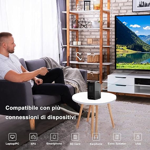 1920*1080P nativo e supporto 4K: L'ultimo mini proiettore aggiornato, il proiettore 1080p nativo supporta la risoluzione 4K, contrasto 20000: 1, 15000 lumen. Con immagini di buona qualità e maggiore luminosità, ti fa sentire come in un cinema. 5G WIFI e Bluetooth Wireless Videoproiettore: Supporta sia 2.4G che 5G, il nostro proiettore Wi-Fi progettato con la più recente connessione WIFI compatibile con Android/iPhone/Windows 10, per ottenere una connessione Wi-Fi. Senza i limiti del filo, comodo per goderti la vita libera sempre e ovunque. -Sistema operativo Android da 1 GB + 8 GB, funzionamento regolare: Il nostro proiettore portatile wifi è con 1 GB di RAM + 8 GB di spazio di archiviazione, rende il mini proiettore portatile più agevole nell'uso. Altoparlanti HIFI 2 * 5 W integrati e ottima qualità del suono: Il mini proiettore cinematografico home theater ha altoparlanti integrati 2 * 5 W, quindi non è necessario collegare altri dispositivi di altoparlanti. I nostri proiettori portatili sono dotati di audio stereo 3D e la qualità del suono è molto buona.