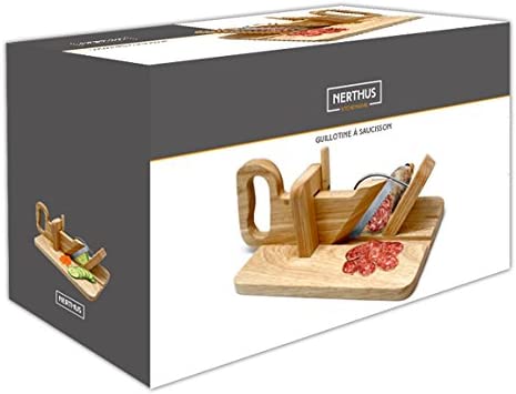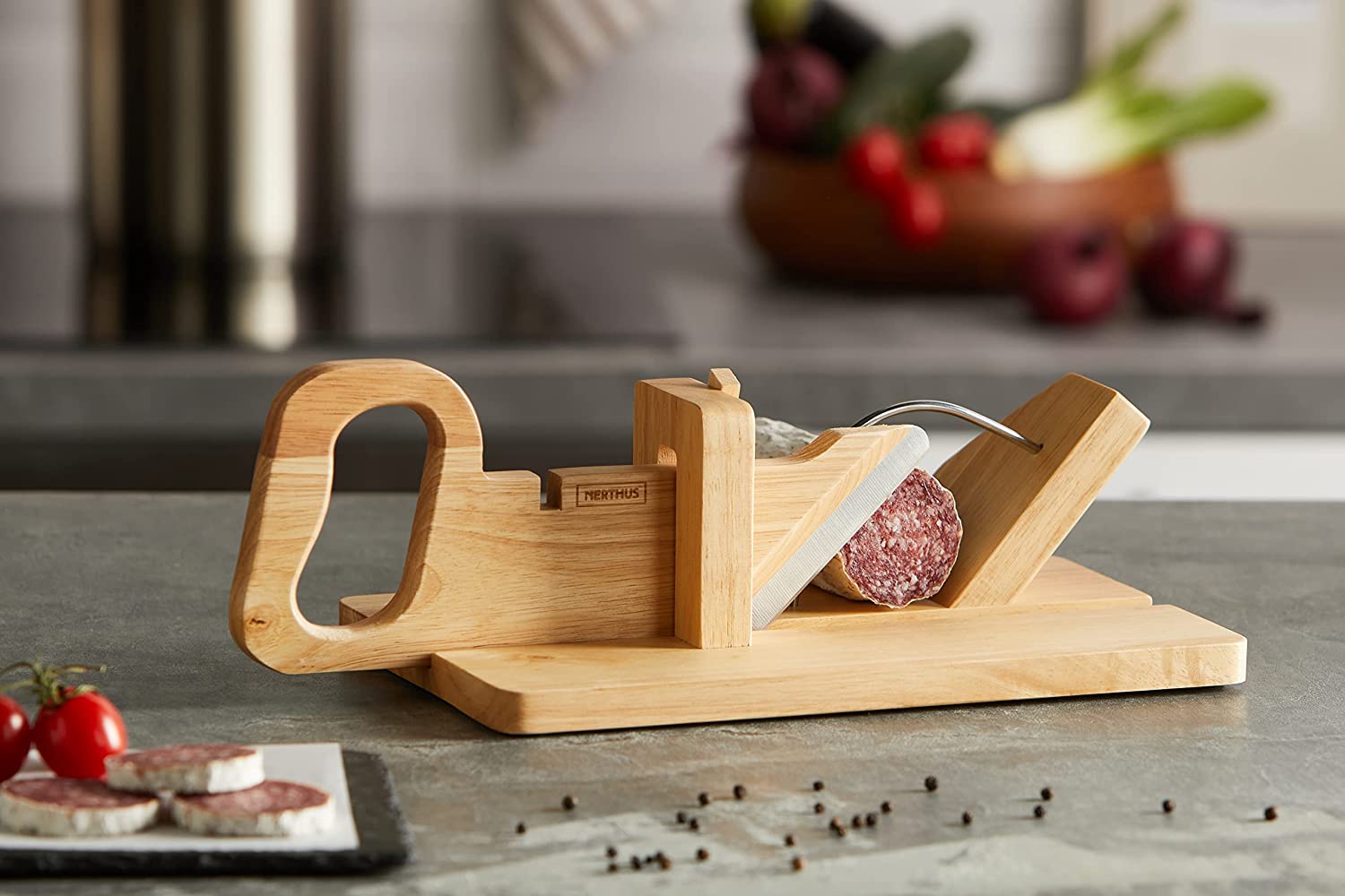 Tagliere per salcicce e salami. In legno con Arco di Sicurezza in Acciaio Inossidabile, 17.5x29.5x13 cm - 795 gr di peso