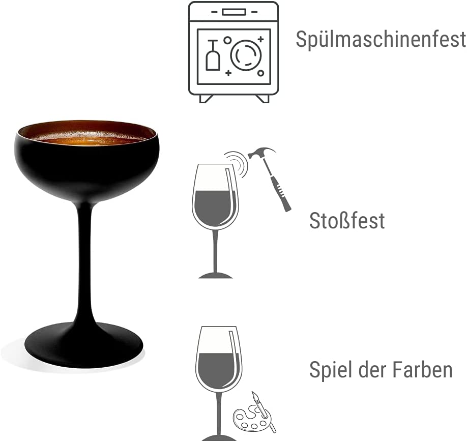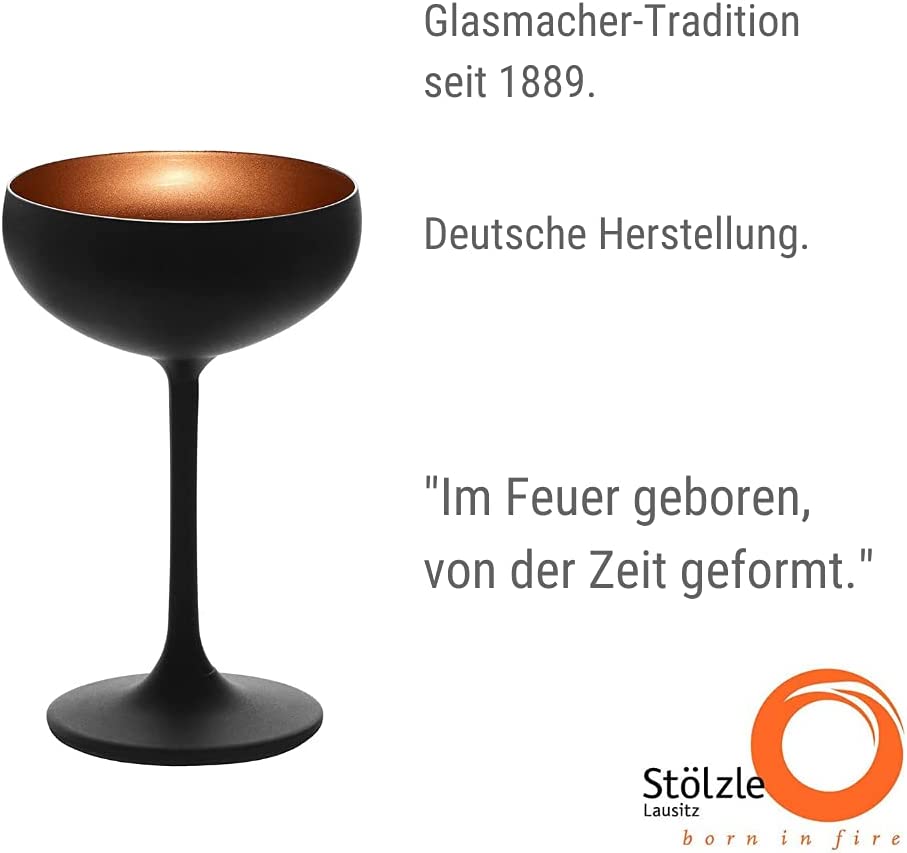 Set di 6 bicchieri da spumante Nero (opaco) Bronzo. Marchio Stölzle Lausitz - Materiale Vetro nero, Bronzo. Capacità 230 Millilitri. Grazie alla tiratura dello stelo dal calice, la coppa da Champagne si presenta elegante e senza cuciture o passaggi percepibili. L’assenza di saldature dona stabilità al calice. Tradizione vetraria dal 1889