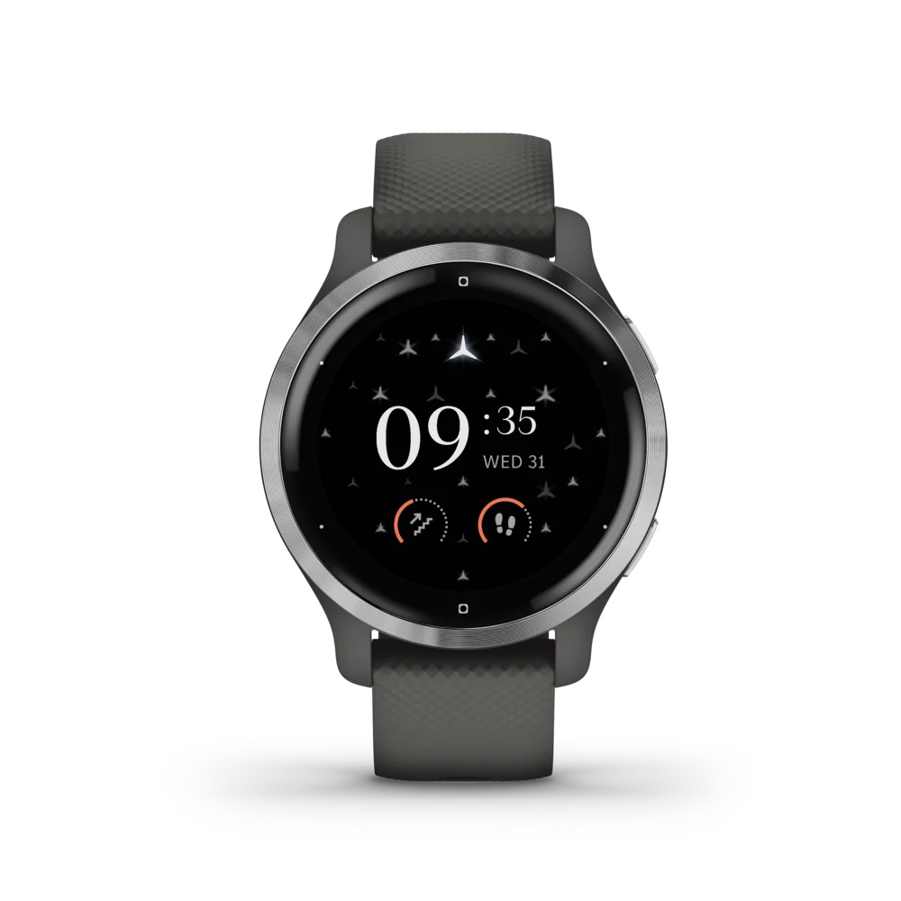 SPORTWATCH GARMIN + MERCEDES-BENZ . Lo smartwatch è compatibile con gli smartphone Android e Apple®, nonché con l'app mobile Garmin Connect™. Inoltre, supporta Garmin Pay ™ per pagamenti facili e punteggi con funzioni di monitoraggio della salute e del fitness che ti consentono di avere una panoramica della tua salute per tutto il giorno. Che si tratti di misurazione della frequenza cardiaca, livello di stress, livello di energia, misurazione della frequenza respiratoria, saturazione dell'ossigeno o analisi del sonno, l'orologio da polso ha tutti i dati a portata di mano. Supporta le funzioni dell'equipaggiamento speciale ENERGIZING Package e ENERGIZING Package Plus, disponibili a partire da NTG 6. La lettura del livello di stress e della frequenza cardiaca controlla queste funzioni dell'attrezzatura speciale, in modo che l'orologio offra suggerimenti per l'attivazione di programmi di vitalità e rilassamento. Le attività possono anche essere registrate utilizzando più di 20 app sportive preinstallate, mentre gli allenamenti con esercizi animati per allenamento con i pesi, cardio, yoga e Pilates incoraggiano l'imitazione. Le singole playlist Deezer, Amazon Music o Spotify® possono essere facilmente caricate sullo smartwatch in modo che la tua musica preferita possa essere riprodotta anche durante lo sport o nella vita di tutti i giorni. Per poter ascoltare questi brani senza uno smartphone, l'orologio da polso può essere collegato a delle cuffie wireless. Lo smartwatch è progettato con una cassa in plastica nera, mentre la lunetta e i pulsanti sono in acciaio inossidabile. La versione Mercedes-Benz del Garmin Venu 2® presenta il marchio Mercedes-Benz. I marchi Mercedes-Benz si trovano sul fondello, all'interno del cinturino e sul quadrante. Anche i quadranti preinstallati sono progettati nel design Mercedes-Benz esclusivamente per questa edizione. La durata della batteria è fino a 8 ore in modalità GPS con musica, in modalità smartwatch l'orologio può essere indossato fino a 11 giorni senza ricarica. I marchi Mercedes-Benz si trovano sul fondello, all'interno del cinturino e sul quadrante. Anche i quadranti preinstallati sono progettati nel design Mercedes-Benz esclusivamente per questa edizione. GARMIN venu® - uomo - impostazioni lingua installate: arabo, bulgaro, croato, ceco, danese, tedesco, inglese (USA), estone, finlandese, francese, greco, ebraico, italiano, lettone, lituano, olandese, norvegese, polacco, portoghese, rumeno, russo, svedese, slovacco, sloveno, spagnolo, turco, ungherese. - impermeabile fino a 5 ATM - misura dati vitali come frequenza cardiaca e livello di stress. - quadranti preinstallati nel design Mercedes-Benz