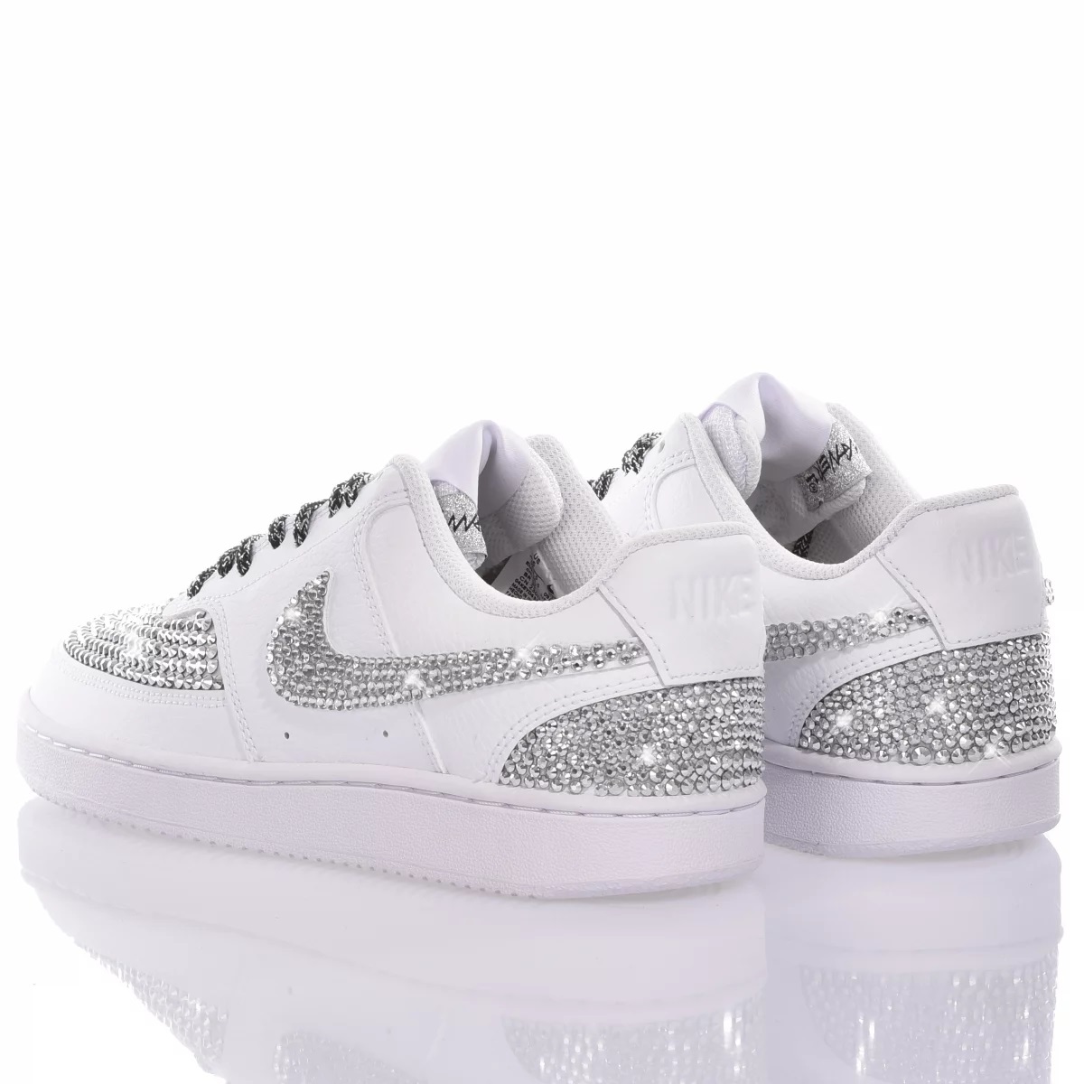 Nike Swarovski Privè Silver è la sneaker custom da donna più desiderata di sempre! Effetto super scintillante grazie agli swarovski applicati totalmente a mano, che ricoprono punta, tallone e baffo. I lacci in trama nero e argento laminato enfatizzano maggiormente la luminosità di questa sneaker. Nike Swarovski Privè Silver viene fornita con i suoi lacci bianchi originali.