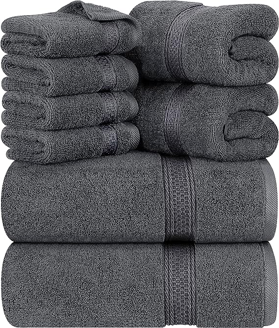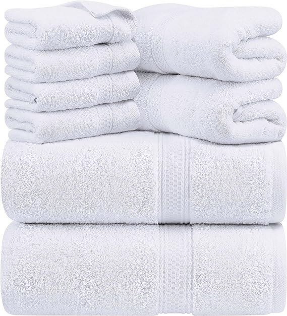 Utopia Towels: Set di Asciugamani: 8 Pezzi; 2 Asciugamani da Bagno, 2 Asciugamani e 4 salviette - Non utilizzare candeggina, ammorbidenti e ferro da stiro perché potrebbe danneggiarne la qualità; lavare sempre gli asciugamani separatamente per ridurre al minimo la lanugine. Il set comprende due teli da bagno (69 x 137 cm), due asciugamani (41 x 71 cm) e quattro asciugamani (30 x 30 cm). Tessuto con 100% cotone filato ad anello. Il cotone filato ad anello non solo dona alla pelle una sensazione di morbidezza, ma è anche molto resistente in natura. Lavare in lavatrice gli asciugamani in acqua calda con un detergente delicato e asciugare a bassa temperatura; si raccomanda di asciugare immediatamente per ridurre al minimo la muffa. Altamente assorbenti, ma leggeri. Danno al corpo un tocco morbido e delicato mentre assorbono l'umidità.