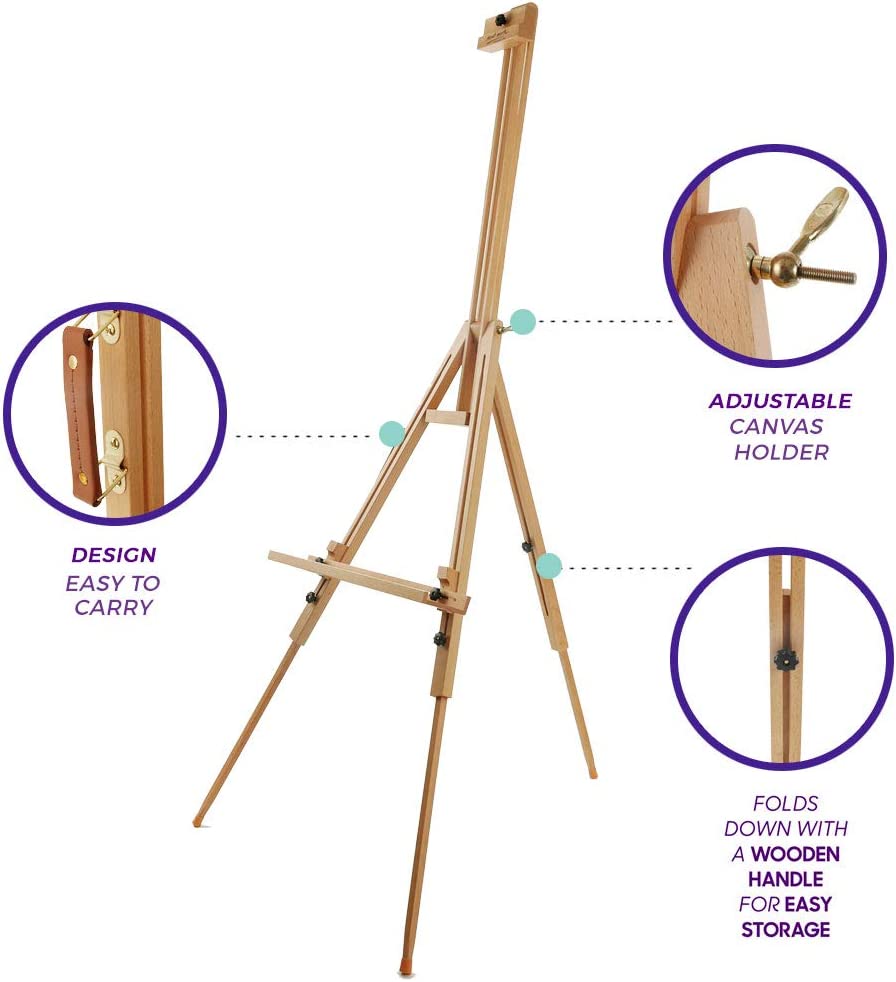 Cavalletto classico a treppiede, adatto a artisti di tutti i livelli. Perfetto per la casa o l'utilizzo in studio. Splendidamente realizzato a mano in legno di faggio stagionato con raccordi in acciaio di alta qualità per garantire la massima stabilità e durata. Include una sporgenza per pennelli e vernici. Facilmente regolabile in diverse posizioni per adattarsi al tuo stile di pittura. Pieghevole per trasportarlo e metterlo via con facilità. Può sostenere una tela alta circa 132 cm. Dimensioni del cavalletto assemblato: larghezza: 80 cm, profondità: 100, altezza: 226 cm.
