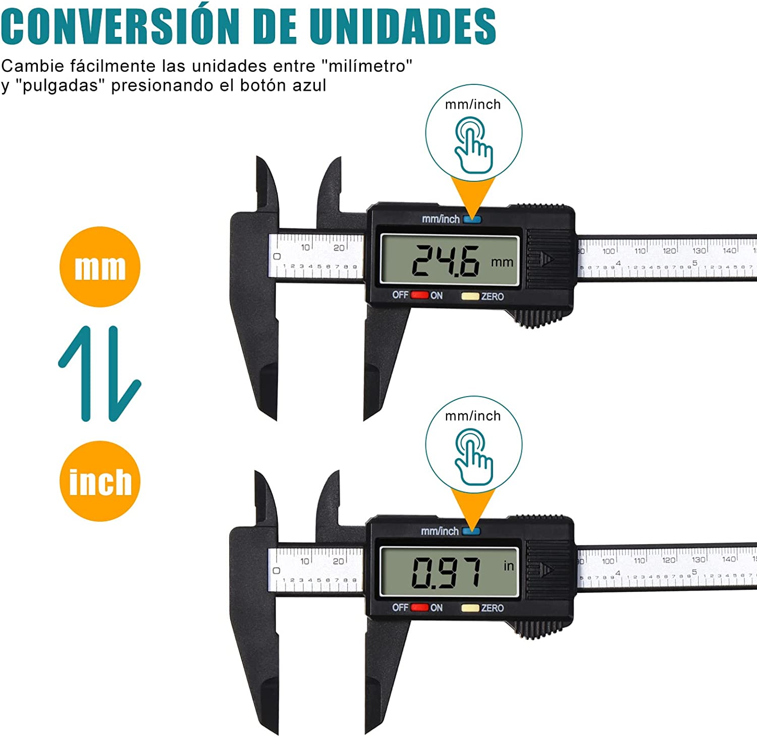 Calibro digitale in materiale composito di plastica e fibra di carbonio, forte, leggero e resistente alla corrosione. La costruzione leggera offre un'eccellente protezione contro la deriva del corpo in plastica dovuta alle vibrazioni della mano e offre un buon equilibrio tra lunghezza di scorrimento e mantenimento del valore. Misurare facilmente e con precisione OD, ID e profondità. Dotato di un display LCD per leggere i risultati rapidamente. Campo di misura del calibro: 0 - 6