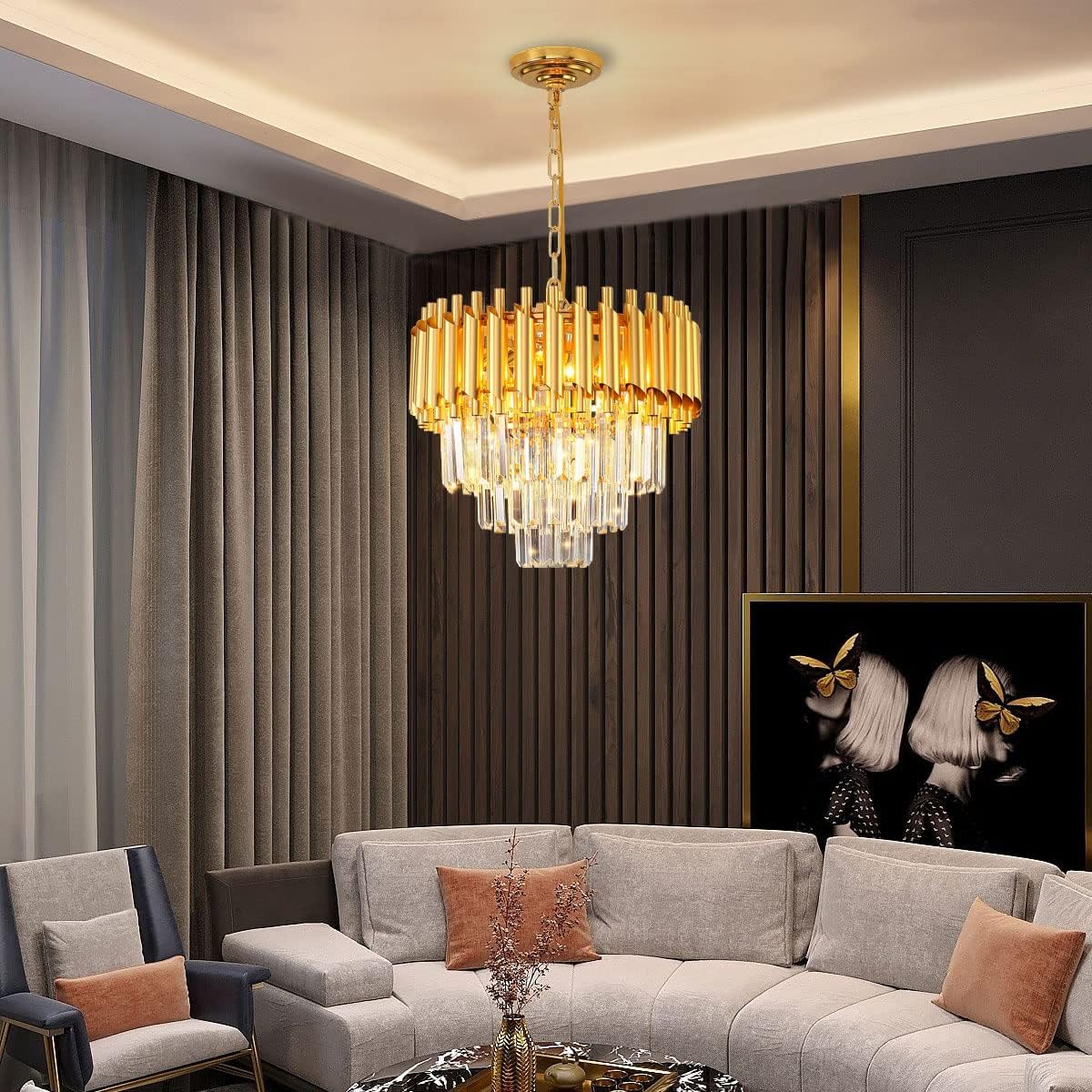 Lampadario di cristallo circolare: combina elementi classici e contemporanei, le linee nere chiare e semplici sono dotate di cristalli K9 di alta qualità per iniettare una brillantezza abbagliante nel tuo spazio. Ampia applicazione: questo lampadario in cristallo dorato si adatta al design della casa classico, moderno, contemporaneo, di lusso, può funzionare su soffitti bassi / alti, soffitti inclinati. Ideale per soggiorno, camera da letto, sala da pranzo, isola cucina, grande ingresso foyer. Dimensioni lampadario: lunghezza 40 cm x larghezza 40 cm x altezza 35 cm, lunghezza della catena del cavo regolabile: 100 cm, scegliere l'altezza adatta alla stanza da installare. Sorgente luminosa: 4 lampadine E14 (lampadine non incluse), max 40 W per lampadina, tensione di ingresso: 220 V. Compatibile con lampadine LED, a risparmio energetico, alogene, ecc.