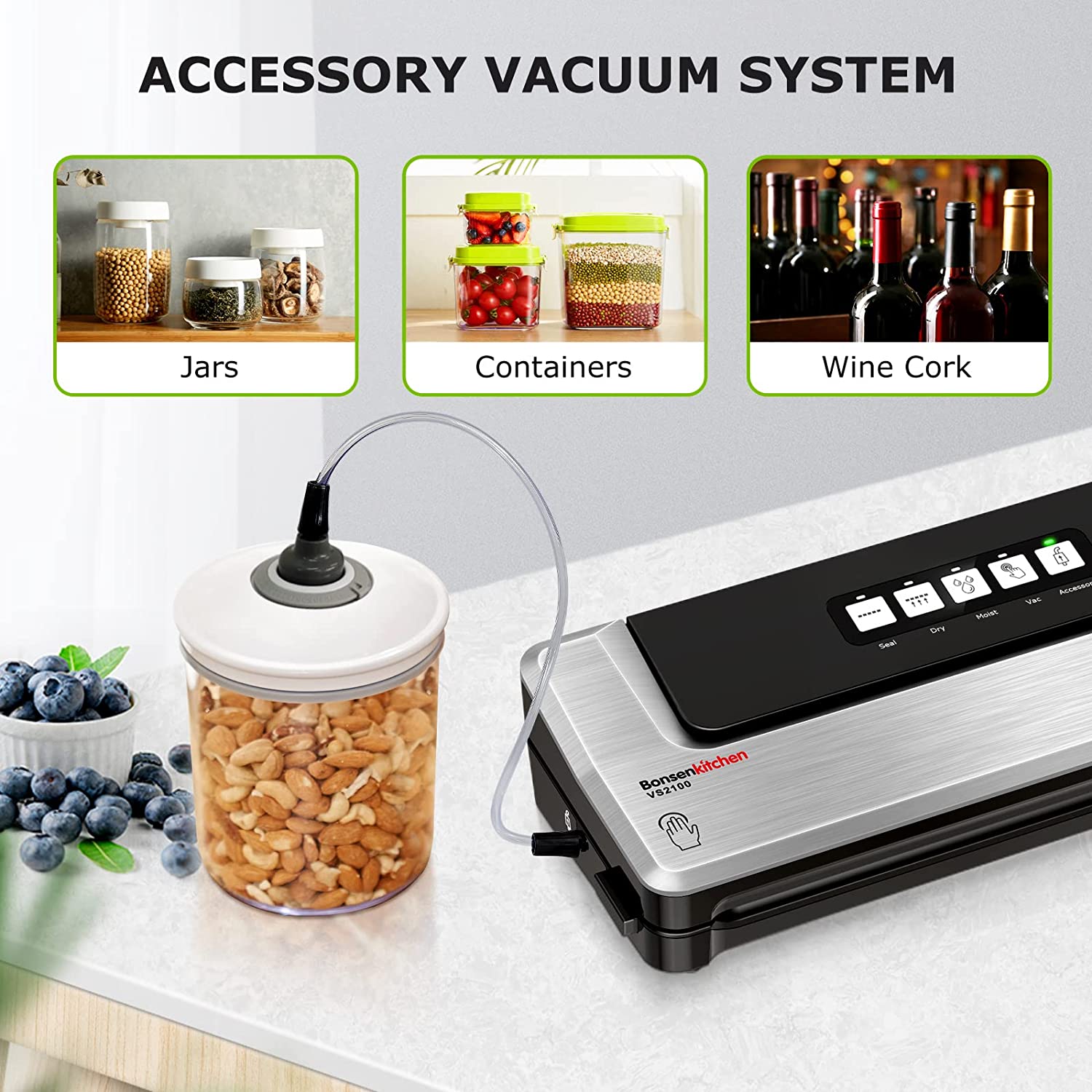 Design compatto : Bonsenkitchen Vacuum Sealer semplifica la conservazione degli avanzi, consentendo di risparmiare denaro, spazio e prevenzione degli sprechi. Fallo la scelta migliore per la tua cucina. Funzione asciutta e umida: Funzione 2 in 1 supportata combinata con vuoto e sigillatura per alimenti secchi e umidi come carne, spuntini anche cibi in camicia, bolliti e al vapore. Design a doppio strato di tenuta: crea una tenuta ermetica con un esclusivo design a doppia guarnizione. Non c'è bisogno di preoccuparsi di problemi di perdite. Può sigillare la maggior parte degli alimenti : come carne, prosciutto, snack, noci, salse, frutti di mare, verdure o frutta per il congelamento o la refrigerazione e altro ancora. Le confezionatrici sottovuoto professionali ti offrono più comodità e funzionalità. Con il nastro sigillante largo 30 cm è possibile sigillare sottovuoto più sacchetti contemporaneamente.