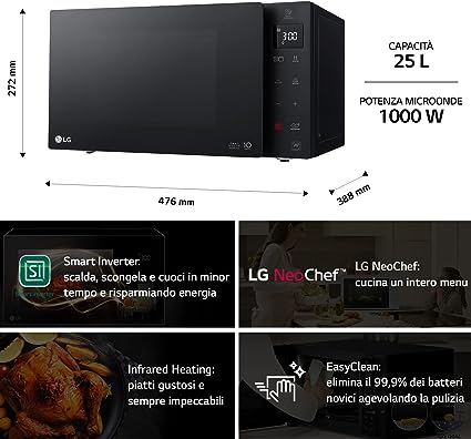Tecnologia Inverter; Piatto girevole; Funzione mantieni al caldo; ; Funzione scongelamento; Funzione riscalda; Funzione auto cottura; Tipo di controllo: Touch; ; Display incorporato; LED; Luce interna; Timer; Grill; Potenza grill: 900 ; Protezione per i bambini