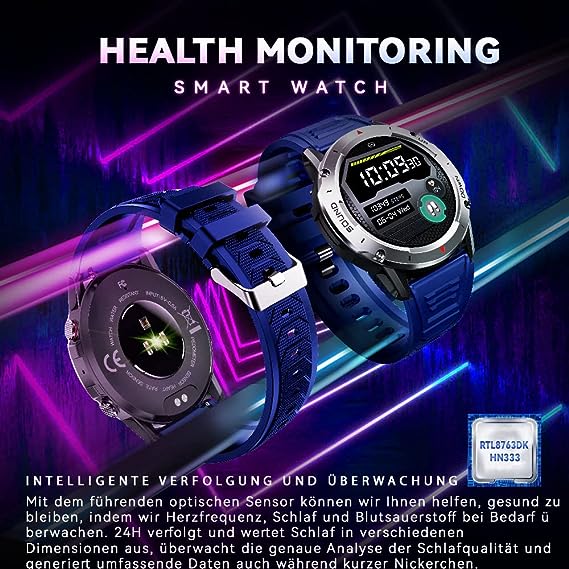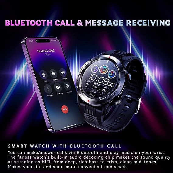 Rispondi/Effettua chiamate e riproduci musica - Altoparlante e microfono integrati per smartwatch , che ti consentono di comporre/rispondere alle chiamate e riprodurre facilmente musica/canzoni dopo aver mantenuto la connessione con i tuoi smartphone. Con una qualità audio chiara e puoi anche vedere i contatti del telefono e le chiamate recenti registrate su questo orologio. Smartwatch uomo con schermo LCD touch da 1,39'', 390 * 390 ad alta risoluzione, 330 PPI pixel, colori più brillanti e immagini più chiare, per un piacere visivo senza precedenti. Adotta uno specchio in vetro minerale temperato, resistente ai graffi e all'usura, durevole e di lunga durata. Il corpo in aerometal lo rende più confortevole ed elegante. - Monitoraggio della salute per tutto il giorno - Sensore PPG ad alta precisione integrato per monitorare la frequenza cardiaca 24 ore al giorno. Può anche salvare i dati della frequenza cardiaca a riposo per 7 giorni per aiutare a monitorare le variazioni della frequenza cardiaca a lungo termine. L'ossigeno nel sangue viene misurato utilizzando un sensore basato sulla luce riflettente sul polso. Mantieni la calma quando avverti mancanza di respiro, debolezza o vertigini. Monitoraggio del sonno in tempo reale - Smart Watch monitora la qualità del sonno attraverso le 3 fasi: veglia, sonno leggero e sonno profondo. Tiene traccia dei tuoi schemi di sonno e respirazione in modo da poter lavorare per migliorare la durata del sonno, la qualità del sonno e rilevare i primi segni di apnea notturna. Impermeabilità e 24 tipi di modalità sportive - 21 modalità sportive e 100+ quadranti commutabili possono soddisfare le vostre esigenze sportive quotidiane come corsa, nuoto, yoga, fitness, ecc con una carica di 3 ore e fino a 7-10 giorni di tempo di. Questo smartwatch può anche cambiare diversi stili di quadranti corrispondenti a diversi scenari di vita.L'altoparlante impermeabile con grado di protezione IP68 ti consente di ascoltare musica o rispondere alle chiamate mentre ti alleni.