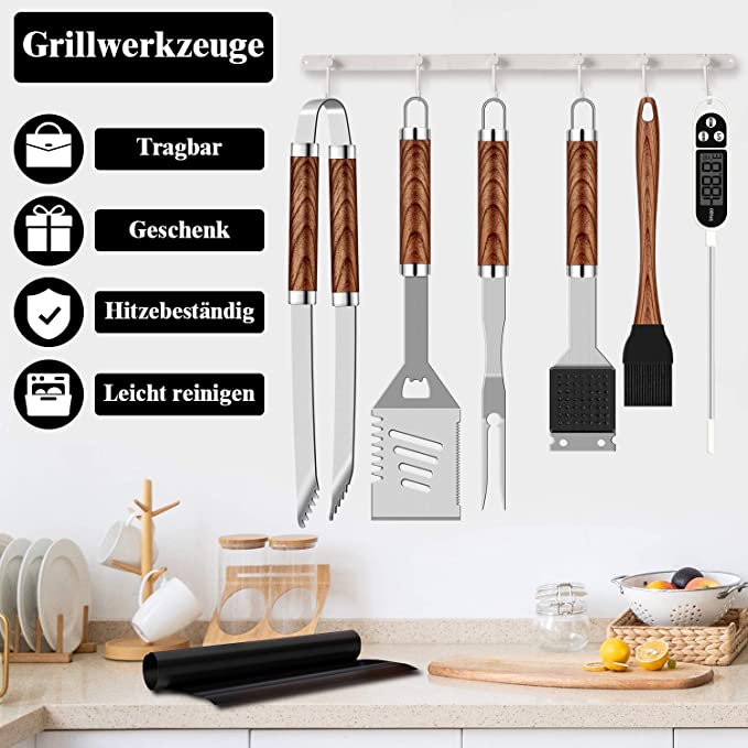 Set di 26 accessori per barbecue in acciaio inox di alta qualità, set di posate da barbecue con valigetta portatile e termometro per carne, colore manico marrone