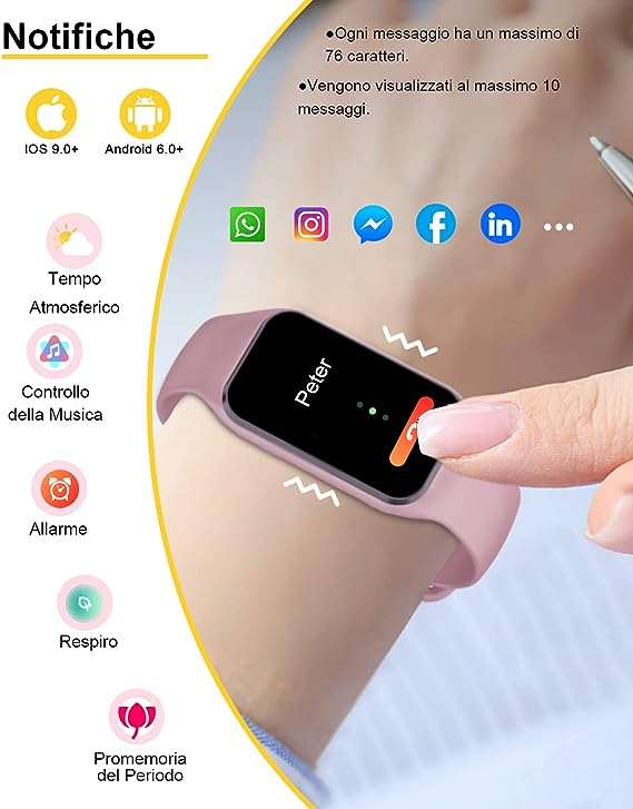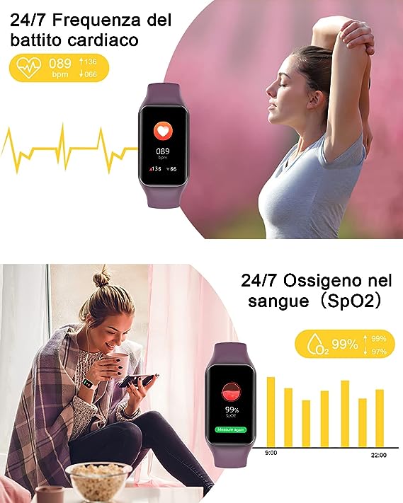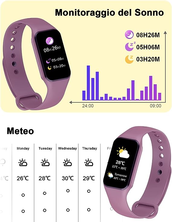 Monitoraggio in tempo reale 24 ore su 24 della frequenza cardiaca e dei dati sull'ossigeno nel sangue. Monitora la i dati sul sonno in base alle tue esigenze. Può anche sincronizzare le condizioni meteorologiche locali in tempo reale di due giorni per farti vedere. Assistente sportivo-5ATM impermeabile. Supporta 24 modalità sportive comuni. Tiene traccia automaticamente dei tuoi passi, distanza e calorie bruciate, aiutandoti con statistiche di attività in tempo reale. È possibile visualizzare più dati nell'app