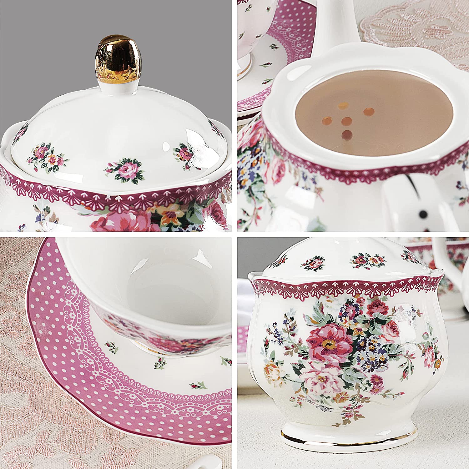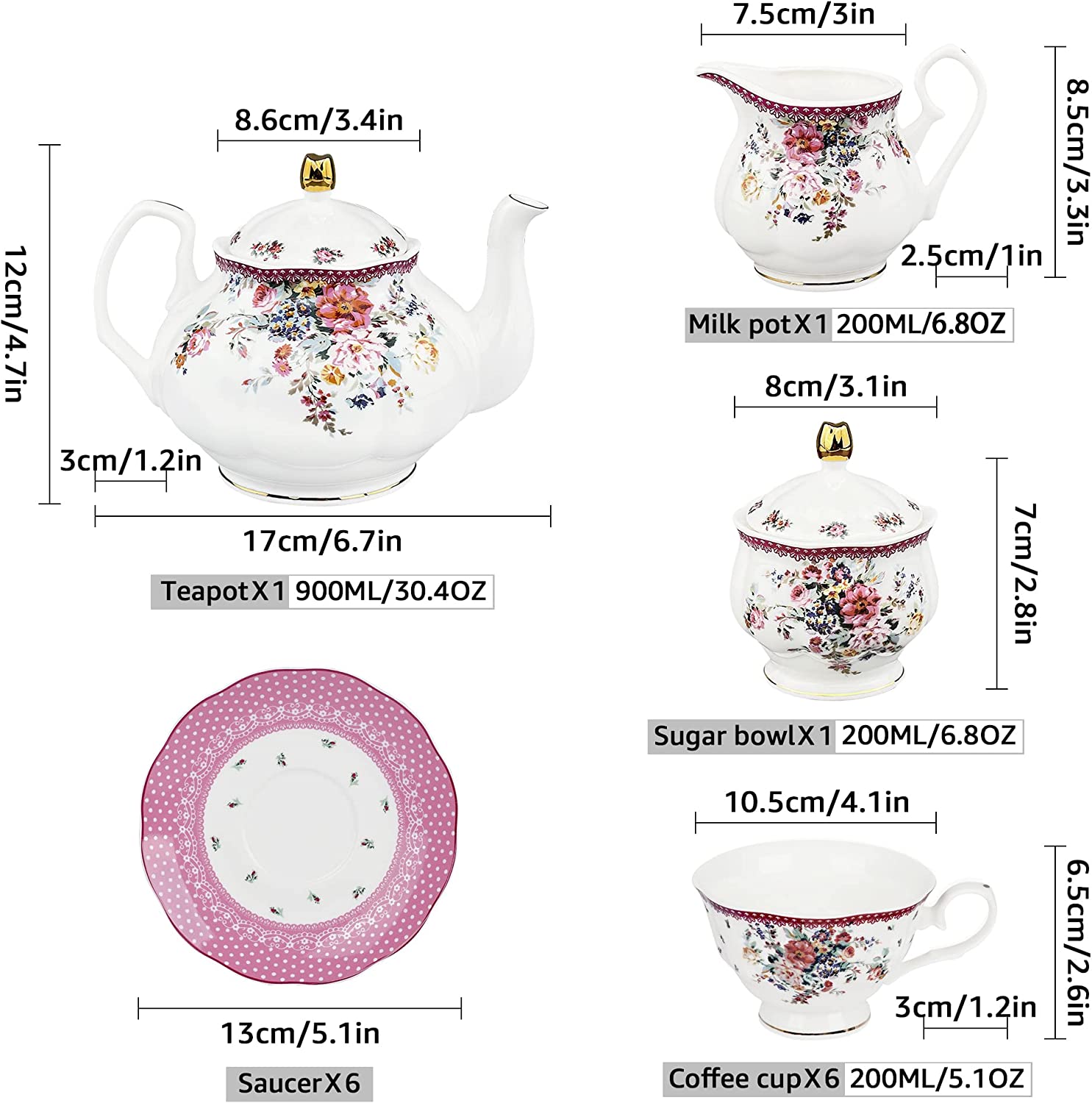 6 Tazze da caffè con piattino. ml.100., caratterizzate da atmosfere immaginifiche e dai disegni armonici dell’arte orientale che la rendono delicata ed elegante nonché al passo con la moda attuale. Capacità della teiera: 900ml, dimensioni: 17 x 12 x 8,6cm; Capacità della tazza: 200ml, dimensioni: 10,5 x 6,5cm; Capacità della zuccheriera: 200ml, dimensioni: 8 x 7cm; Capacità della brocca del latte: 200ml, dimensioni: 7,5 x 8,5 cm; Piattino diametro: 13cm; Cucchiaio: 13 cm.