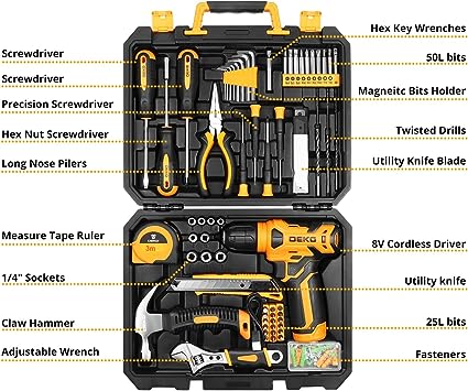 8V trapano professionale LED - 8V trapano a corda non alimentato può essere utilizzato per forare fori in legno e plastica, o per stringere / allentare le viti. Premere l'interruttore per regolare la velocità del trapano elettrico. La velocità massima senza carico del mini trapano elettrico è 800r / min. Dotato di luce LED integrata, il peso netto del trapano manuale è solo 0,75 kg, che è conveniente per il funzionamento a mano singola. Utilizzare una batteria ricaricabile da 1.5AH. Il cavo trapano C-DEKO è dotato di un cavo di ricarica C-1.5AH. È possibile collegarlo a un caricabatterie universale o a un'uscita USB (5VD. C) per caricare l'utensile. Quando l'indicatore verde della batteria è stabile e non lampeggia, la batteria è piena. Materiale di alta qualità, forte e durevole - lo strumento DEKO è realizzato in acciaio cromato CR-V di alta qualità per prevenire corrosione e ossidazione. Coperto da una robusta maniglia in gomma per un migliore controllo. Strumenti essenziali per la casa - Questo set di utensili elettrici professionali per la casa contiene gli strumenti di progettazione, manutenzione o manutenzione più pratici e avanzati. È molto adatto per decorazione, assemblaggio di mobili, perforazione, taglio, giardinaggio, ufficio o manutenzione domestica quotidiana. Gli utensili sono accuratamente conservati in una scatola robusta per mantenerli sicuri, puliti, ordinati e facili da trovare.