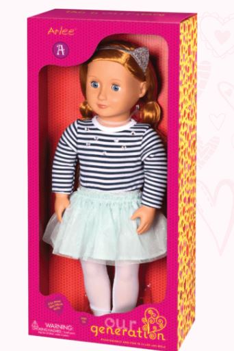È una giornata perfetta per il divertimento e l'avventura con Our Generation Regular Doll - Arlee, una bellissima bambola alta 46 cm con occhi azzurri e capelli lunghi, lisci, rosso rame. I capelli di Arlee sono morbidi come la seta e divertenti da pettinare e acconciare. Indossa un vestito meraviglioso, un po' bizzarro, un po' scintillante e molto divertente! Il suo outfit include una t-shirt a righe a maniche lunghe con decorazioni di gemme luccicanti sul davanti. Indossa una gonna verde mare, collant chiari e scarpe basse rosse. Per finire, Arlee indossa un adorabile cerchietto con orecchie di gatto glitterate color argento. Mi(w)ao è un ottimo modo per aggiungere un po' di brillantezza quando sei un
