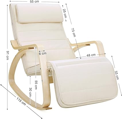 Un abbraccio fidato: Oscilla dolcemente tra i braccioli in legno di betulla di qualità! Completati da un telaio in ferro, rendono la sedia a dondolo affidabile e in grado di reggere fino a 150 kg. Libera la mente da preoccupazioni e abbandonati al relax! Un po’ più in su, un po’ più in giù: Regola il poggiapiedi di questa poltrona a dondolo nella maniera che più si adatta a te. Con 5 diverse posizioni a cui può essere regolato, è perfetto sia per fare un pisolino che per leggere un libro - Ah, che comodità! Con design ergonomico che si adatta alla curvatura del corpo, imbottitura in spugna ad alta densità e poggiatesta rimovibile per rilassare il collo, l’unica cosa che penserai su questa sedia a dondolo sarà che non vorrai più alzarti Felicità per la tua pelle: Dì addio a sedute in pelle che ti fanno appiccicare alla sedia. Questa poltrona a dondolo ha un rivestimento sfoderabile in cotone, soffice e delicato sulla pelle, per godere di una fresca esperienza di seduta - Istruzioni chiare per un facile assemblaggio e una sedia a dondolo dall’accogliente stile scandinavo che può essere utilizzata in soggiorno, cameretta dei bambini o giardino!