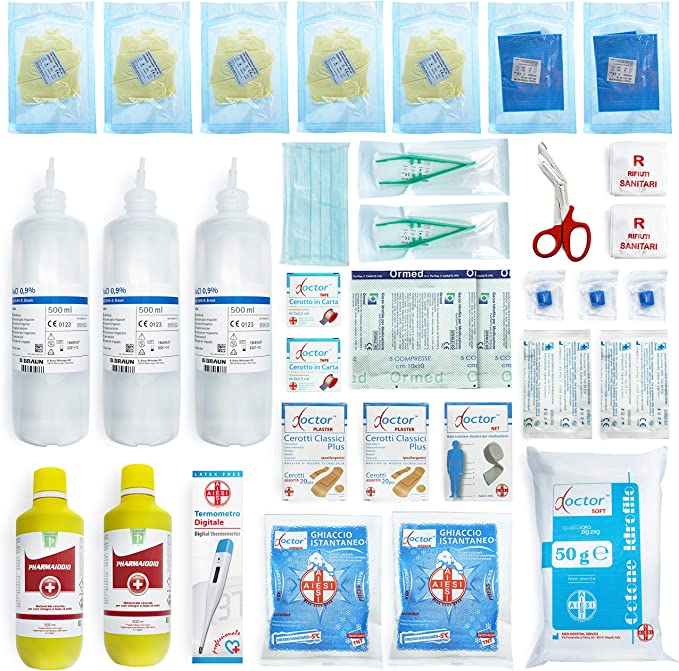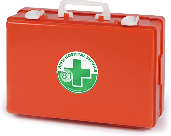 Componenti inclusi: 5 Paia di guanti sterili monouso - 1 Visiera paraschizzi - 2 Flaconi di soluzione cutanea di iodopovidone al 10% da 500 ml - 3 Flaconi di soluzione fisiologica (sodio cloruro 0,9%) da 500 ml - 10 Compresse di garza sterile 10x10 cm in buste singole - 2 Compresse di garza sterile 18x40 cm in buste singole - 2 Teli sterili monouso - 2 Pinzette per medicazione sterili monouso - 1 Confezione di rete elastica per tutte le esigenze - 1 Confezione di cotone idrofilo da 50 g - 2 Confezioni di cerotti assortiti pronti all'uso da 20 pz - 2 Rotoli di cerotto su rocchetto m 5x2,5 cm - 1 Forbici per medicazioni autoclavabili 14,5 cm - 3 Lacci emostatici anallergici - 2 Ghiaccio istantaneo sacchetto pronto uso - 2 Sacchetti monouso per la raccolta di rifiuti sanitari - 1 Termometro digitale ad alta precisione - 1 Apparecchio per la misurazione della pressione arteriosa professionale con stetoscopio- 5 Paia di guanti sterili monouso - 1 Visiera paraschizzi - 2 Flaconi di soluzione cutanea di iodopovidone al 10% da 500 ml - VALIGETTA in plastica antiurto con supporto per attacco a parete, maniglia per trasporto, guarnizione in neoprene, chiusura con 2 clips rotanti Prodotto comunemente utilizzato per il primo soccorso di emergenza in Aziende o unità produttive del gruppo A e B e comunque con 3 o più lavoratori secondo il D.M. 388 del 15/07/2003 e s.m. DL/81 Dimensioni mm 395x270x135h - Colore arancio - Peso 6,2 Kg (completa di presidi)
