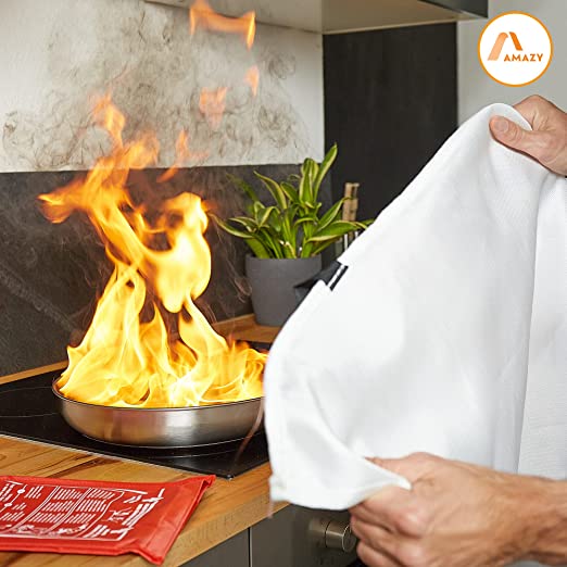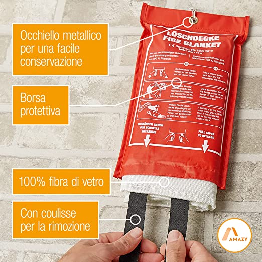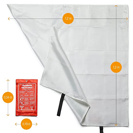 Taglia: 1.2 x 1.2 M - Set di 1 - Coperta antincendio di sicurezza secondo la norma DIN EN 1896 del 1997 per estinzione di piccoli incendi ed emergenze - Munito di pratica borsa protettiva con occhiello metallico per sospensione visibile - Include 2 maschere respiratorie per la rianimazione bocca a bocca igienica per i primi soccorritori con cinturini per un comodo collegamento, ad es. sulla cintura o portachiavi - Manuale di istruzioni in tedesco, inglese, francese, spagnolo e italiano sul lato della sacca - 100% fibra di vetro - Dimensioni: 1,2 x 1,2 m