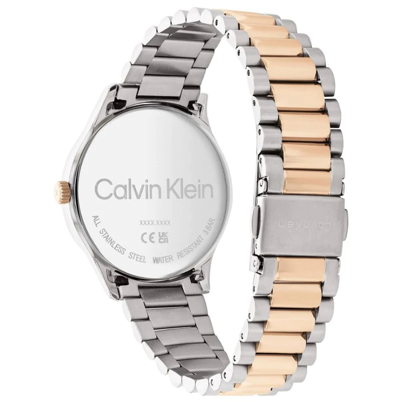 Orologio unisex Calvin Klein collezione Iconic Bracelet. Movimento al quarzo e funzioni di solo tempo. Cassa in acciaio inox placcato oro rosa e silver, dal diametro di 35 mm. Quadrante silver con indici a bastoni rosa e logo a ore 3. Cinturino a maglie in acciaio anallergico oro rosa e silver. Chiusura deployante con pulsanti. Resistente all'acqua 3 Atm.