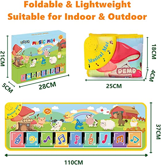 Colore: 9 Colori – Suoni Animali - Marchio Lobyoh -Materiale: Plastica - Dimensioni articolo: LxPxA 28 x 20 x 4 cm - 5 modalità di gioco Il tappeto musicale per bambini - contiene 9 tasti del pianoforte, 8 simpatici versi di animali e 9 melodie, con i pulsanti della modalità Demo e Switch, i bambini possono giocare in 5 diverse modalità. Il tappeto pianoforte musicale produce un suono piacevole e chiaro. Volume regolabile a 5 livelli(Regola il volume premendo ''+'', ''-'' tasti.), protegge l'udito del bambino e riduce il rumore. Con un effetto luce soffusa, protegge gli occhi del bambino - Realizzato in tessuto morbido, molto sensibile al tatto, facile per far ascoltare la musica ai bambini. Design antiscivolo - Il tappetino da ballo può essere piegato a 25 × 18 cm, dimensioni originali: 110 × 37 cm - Il tappetino per tastiera per pianoforte è adatto per l'uso all'interno e all'esterno, facile da riporre e trasportare all'esterno. Alimentato da 3 batterie AA (non incluse).