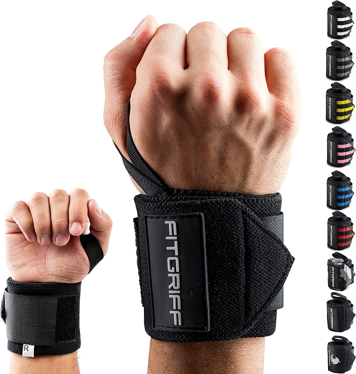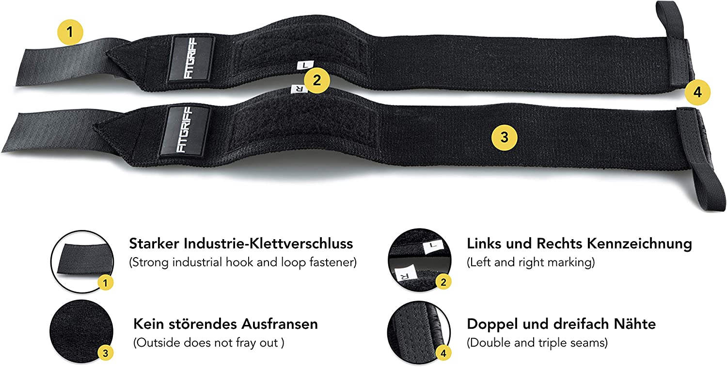 MASSIMA POTENZA E MENO DOLORE - con le fasce da polso FITGRIFF ottieni un prodotto di marca affidabile per l'allenamento della forza. I supporti per i polsi offrono una protezione di prima classe e la massima stabilità per i polsi. Indispensabile per distensioni su panca, presse per spalle, dip ecc. ROBUSTO E DUREVOLE: una robusta chiusura in velcro industriale, cuciture rinforzate e lavorazione pulita rendono i poggiapolsi molto resistenti e affidabili. La nostra speciale superficie esterna, che riduce al minimo lo sfilacciamento, non ha rivali. VELOCE E FLESSIBILE: l'etichettatura discreta sinistra e destra sulle bende consente un'applicazione rapida e semplice durante lo sport. Grazie al mix elastico di materiali, la fermezza delle bende per il polso può essere regolata in modo flessibile e consente una TAGLIA UNICA per donne e uomini. QUALITÀ PREMIUM: il cotone di alta qualità garantisce un comfort confortevole con una piacevole sensazione sulla pelle. Il sottile logo in gomma dall'aspetto 3D dà il tocco finale a un design sportivo e allo stesso tempo elegante. Larghezza di banda 8 cm