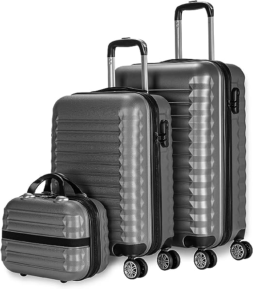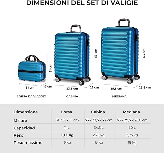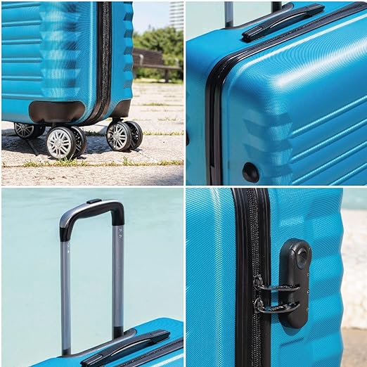 Materiale ABS testurizzato. Set di valigie rigide, leggere e resistenti agli urti. Impermeabile e resistente all'acqua, materiale lavabile molto facile da pulire. Protezioni laterali di rinforzo e supporto orizzontale. Cerniera a doppio cursore. 4 ruote doppie 360° multidirezionali e silenziose su superfici lisce, scivolano delicatamente accompagnando lo spostamento e rendendolo più comodo e senza sforzo. Eccellente mobilità. Lucchetto di combinazione laterale per viaggiare al sicuro e proteggere i tuoi oggetti personali. Manico telescopico e maniglia: manico telescopico in alluminio (2 livelli medi e 3 livelli di cabina) e maniglia superiore, permette di manovrare rapidamente in spazi ristretti. Massimo comfort in qualsiasi posizione. Salvaspazio: interno con fodera interna, cinghie elastiche di fissaggio regolabili e scomparto separatore con cerniera. Riponi una valigia per risparmiare il massimo spazio.