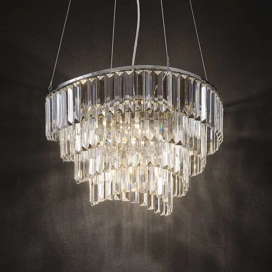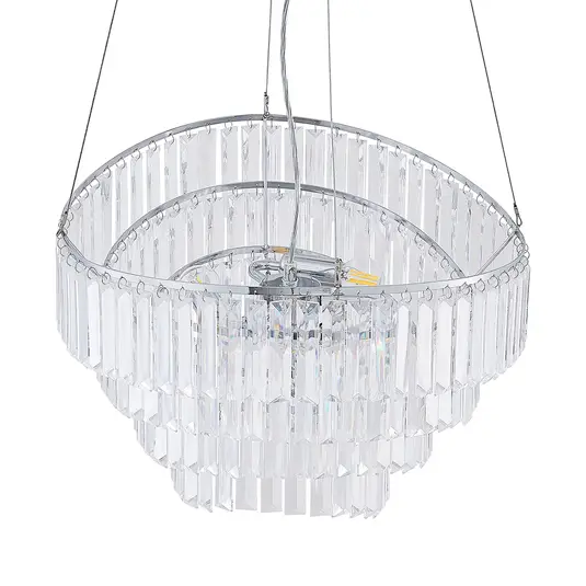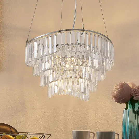 Lampada a sospensione Volina in cromo crea effetti di luce speciali - La lampada a sospensione Volina brilla in un moderno cromo e crea bellissimi accenti di luce nella stanza. In primo piano il paralume sporgente, che si staglia come un elegante lampadario. Si compone di molti piccoli elementi trasparenti, che sono attaccati in quattro strati uno sopra l'altro e forniscono una bella scintilla. Se si utilizzano lampade E14 dimmerabili e se è già disponibile un dimmer standard da parete, la luminosità della lampada può essere regolata in pochissimo tempo in base alle proprie esigenze. Il look glamour di Volina non solo valorizza il proprio salotto, ma può essere utilizzato anche nel settore della ristorazione o alberghiero. Materiale metallo, acrilico - Colore cromo, trasparente -Attacco E14 - Lampadina 4 x 40 W - Dimmerabile - Altezza (in cm) 32 - Sospensione (in cm) 150 - Diametro (in cm) 45 - Altre misure rosone -15 cm, altezza 2,5 cm - Tensione di esercizio Volt 230 - Tensione di alimentazione Volt 230 - Tipo di protezione IP20 - Classe di protezione I
