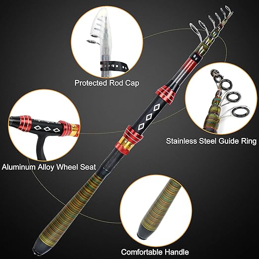 Kit da pesca da 109 pezzi # È un kit da pesca all-in-one con una canna da pesca in fibra di carbonio da 7 piedi, un mulinello da pesca rotante, un anello in lega ad alta resistenza, oltre a vari crankbaits, float bobber, esche morbide, teste piombate e girelle per offrire una selezione sufficiente per adattarsi a diversi tipi di situazioni di pesca. È incluso anche uno zaino ben progettato. - Materiale di alta qualità con la più recente tecnologia # Canna da pesca 100% in fibra di carbonio costruita con tecnologia IM6 Carbon Matrix, che è 1) leggera 2) offre un'elevata resistenza alla trazione 3) essere comoda da impugnare che aumenta le prestazioni, la sensibilità e la potenza 4) durevole; Anello in nylon rinforzato che offre un'esperienza di pesca estremamente fluida senza blocchi. - Portatile e facile da trasportare # La canna da pesca portatile Hightingale presenta un design pieghevole che la rende abbastanza portatile da poter essere portata con sé. Uno zaino appositamente progettato per trasportare facilmente il palo e altri accessori e proteggerli da eventuali danni. -Potente mulinello da spinning # Il mulinello da pesca RG3000 è composto da 12 cuscinetti a sfera di qualità e 1 cuscinetto antiritorno unidirezionale ad arresto istantaneo. Il rumore è stato ridotto e l'esperienza di pesca può essere molto rilassante e divertente. I mulinelli da pesca contengono anche una bobina in alluminio CNC ad alta capacità e un manico in alluminio reversibile per il recupero che può cambiare da sinistra a destra. Capacità: LBS/YDS: 0,18/240 0,20/240 0,25/140