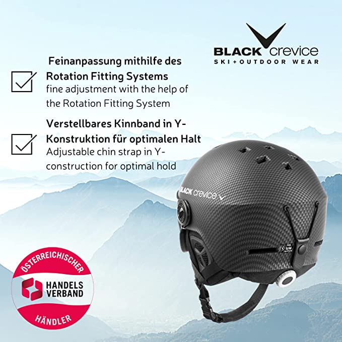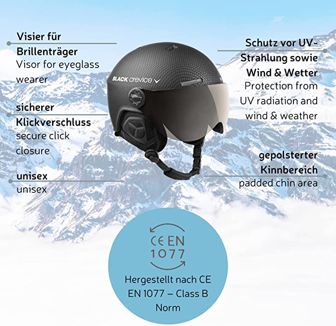 BLACK CREVICE - Casco da sci Gstaad I con visiera stile pilota unisex. In policarbonato traspirante. Regolabile - Marchio Black Crevice - Nome modello Gstaad - Materiale esterno Policarbonato - ADATTAMENTO PERFETTO - Mentoniera imbottita regolabile e una cinghia continua regolabile dietro la testa - Così si adattano precisamente alla forma della testa - TRASPIRANTE - L’imbottitura traspirante estraibile e antibatterica in tessuto e pile e l’innovativo sistema di passaggio dell’aria del casco da sci garantiscono una testa sempre fresca - DURATURO E ROBUSTO - Questo casco con visiera è realizzato con lo speciale processo in-mould - Il risultato è una struttura del casco estremamente stabile, resistente agli urti e molto leggera - SICURO E AFFIDABILE - Tutti i caschi da sci e snowboard sono prodotti rispettando la norma europea di sicurezza vigente ed esigenze severe per la sicurezza e la salute - Tutto per la tua sicurezza - BLACK CREVICE - Azienda austriaca che sa cosa è importante per l’inverno e per le dotazioni outdoor. I suoi prodotti uniscono la protezione ottimale al maggiore comfort