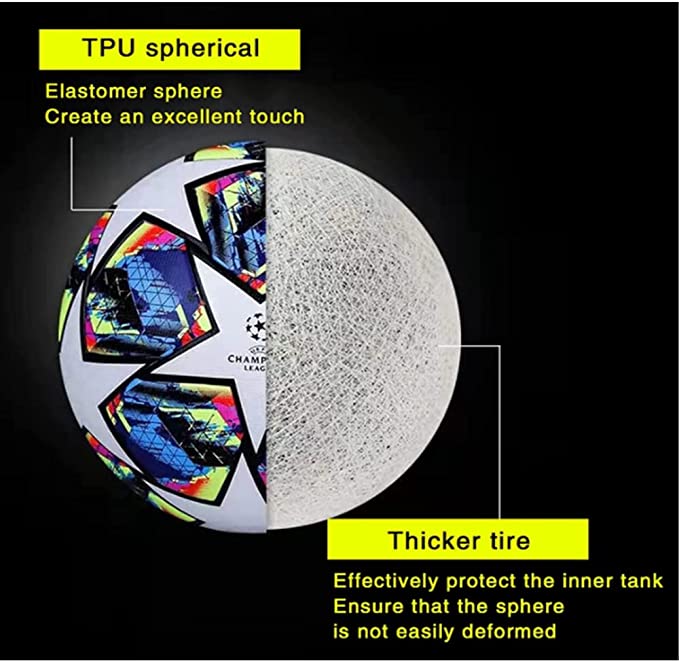 Palla da gioco della Champions League. Si tratta di una palla di precisione utilizzata dai club della Liga europea. Offre solo 5 yards, il che è perfetto per giocatori seri! Materiale: rivestimento in pelle PU, impermeabile, anti-estrusione, palla molto professionale - Prestazioni: l'esclusiva tecnologia di legame termico sullo strato di schiuma può creare uno strato di copertura liscio e senza cuciture, una superficie uniforme e un ridotto assorbimento di acqua, garantendo prestazioni eccellenti che non sono influenzate dalle condizioni atmosferiche Texture: la superficie strutturata della palla riduce le turbolenze e stabilizza le turbolenze durante il volo. questo può migliorare la capacità di controllare la palla, rendendo il passaporto più preciso e preciso