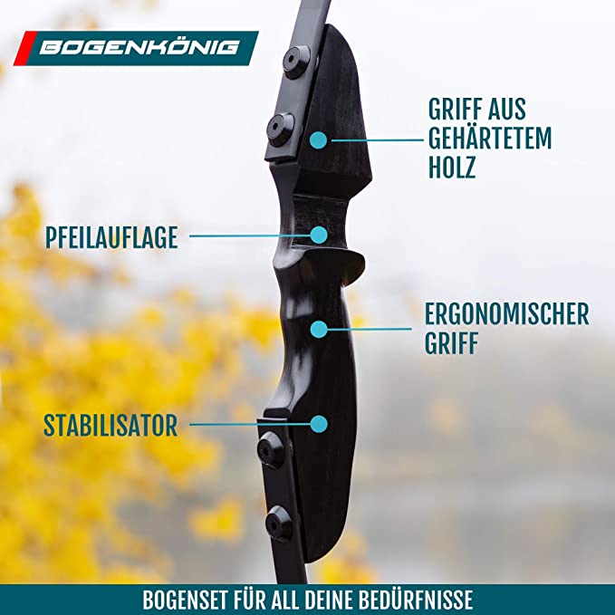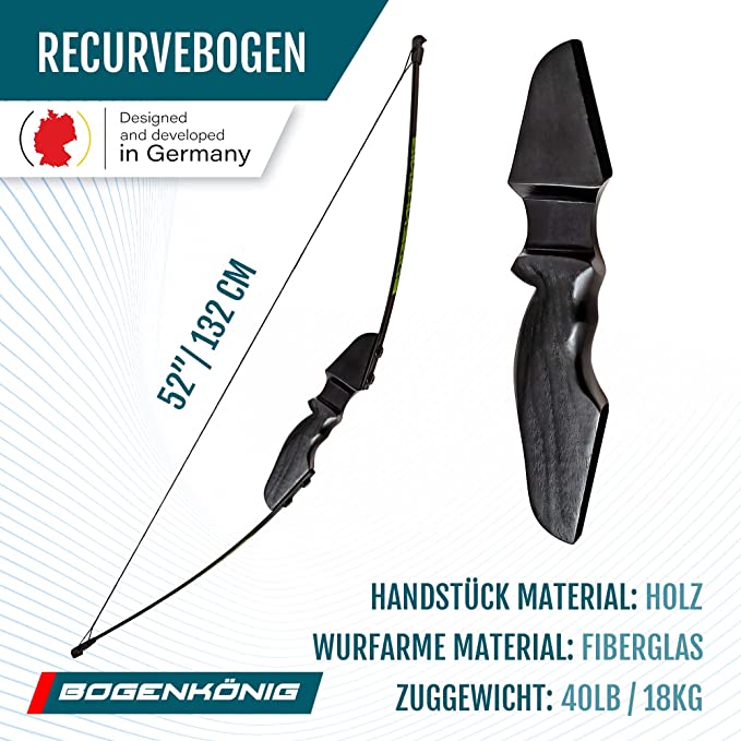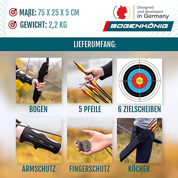 Arco e frecce per adulti che vogliono imparare il tiro con l'arco. Set arco incl. faretra per frecce, frecce per il tiro con l'arco e paracolpi per l'arco. L'arco è fatto di legno robusto e fibra di vetro secondo gli standard di qualità tedeschi. Il set di tiro con l'arco serve anche come regali ideali per gli adolescenti, così come per arco e frecce adulti. Tutto ciò di cui hai bisogno per iniziare è incluso nel pacchetto. Facile da assemblare il set di arco composto e pronto per iniziare immediatamente. Set di arco frecce ideale per i principianti. 1x arco Bogenkönig incl. corda 6x frecce arco con punta 1x faretra 1x protezione per il braccio 1x protezione per le dita. ATTENZIONE Il set di archi per adulti ha una forza di trazione di più di 18 kg e non è un giocattolo, ma un arco e frecce professionale. Gli sportivi inesperti devono necessariamente andare in un campo sportivo progettato per questo scopo. Le frecce dell'arco possono causare ferite.