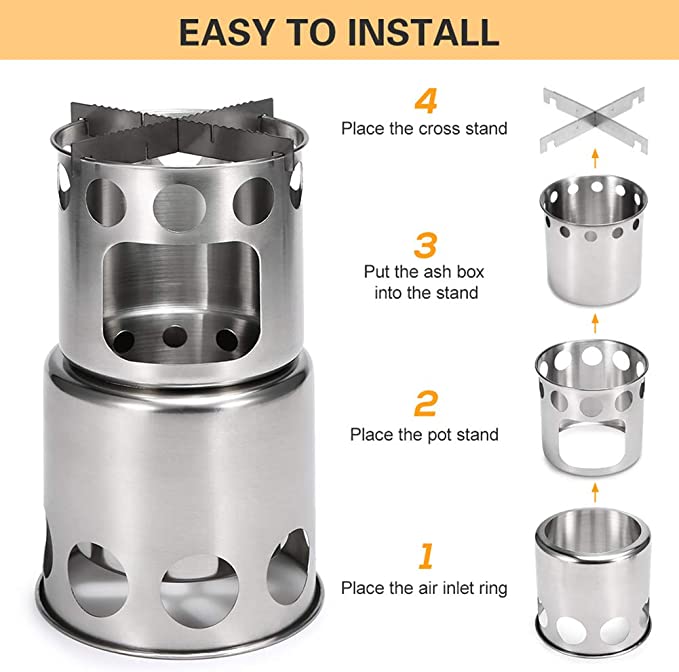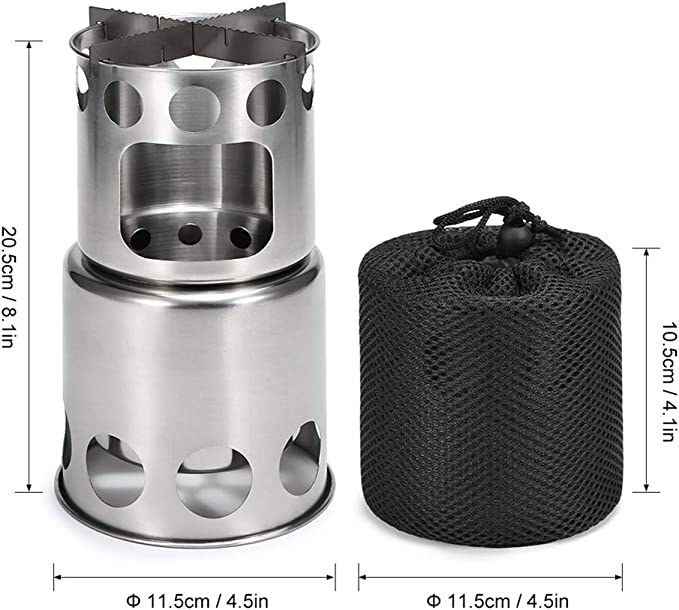 Stufa da campeggio portatile: leggera e facile da piegare. Con sacchetto di stoccaggio. La dimensione pieghevole del pacchetto è di 4,5 pollici x 4,5 pollici x 4,1 pollici / 11.5cmx 11.5 cmx10.5 cm, e il peso è 0,2 kg. Il design compatto rende facile imballare la stufa all'aperto in un piccolo sacchetto di stoccaggio, lasciando da parte per il tuo zaino più spazio - Acciaio inossidabile resistente: è realizzato in acciaio inossidabile di alta qualità, indipendentemente dal suo peso o dal suo calore, abbastanza da bruciare il legno. La struttura è leggera e maneggevole, che garantisce una durata estremamente elevata. La robusta struttura in acciaio inossidabile consente di posizionare stabilmente le pentole sulla stufa Stufa a legna efficiente: la nostra stufa a legna adotta una struttura a doppio strato con fori di ventilazione in basso, che può consentire all'aria di fluire nell'area di combustione e produrre una combustione secondaria, quindi non verrà prodotto fumo nero durante l'uso. Carburante naturale ed ecologico: a differenza delle tradizionali stufe a gas, le stufe da campeggio offrono un ambiente semplice per il campeggio. Puoi naturalmente ottenere rami, foglie, fieno e pigne dalla natura come il carburante originale