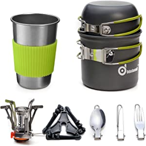 10 pezzi pentole set da campeggio. Incluse 1 x mini fornello da campeggio, 1 x pentola antiaderenti in alluminio, 1 x tegame con manici ripieghevoli, 1 x cucchiaio, 1 x forchetta, 1 x coltello, 1 x tazza di acciaio inossidabile (16 once) con protezione in gomma, 1 x base per bombola a gas, 2 x sacchetto trasporto. Facile da Usare e Regolabile: il sistema di accensione piezoelettrica del fornelletto da campeggio, lo rende molto facile per il campeggio o l'escursionismo all'aperto e supporta la fiamma regolabile. Resistente e Durevole: La pentola e il tegame con manici ripieghevoli e antiscottatura. Realizzati con alluminio anodizzato non tossico e una struttura forte, ogni pentola è solida e leggera. Conduce il calore rapidamente ed è un equipaggiamento di sopravvivenza costruito per durare a lungo. Facile da Portare e Compatto: le maniglie pieghevoli sulla pentola da campeggio o sulla stufa possono essere piegate per risparmiare spazio. Di piccole dimensioni e portatile, il tutto compattabile con minimo ingombro per il trasporto anche dentro lo zaino.