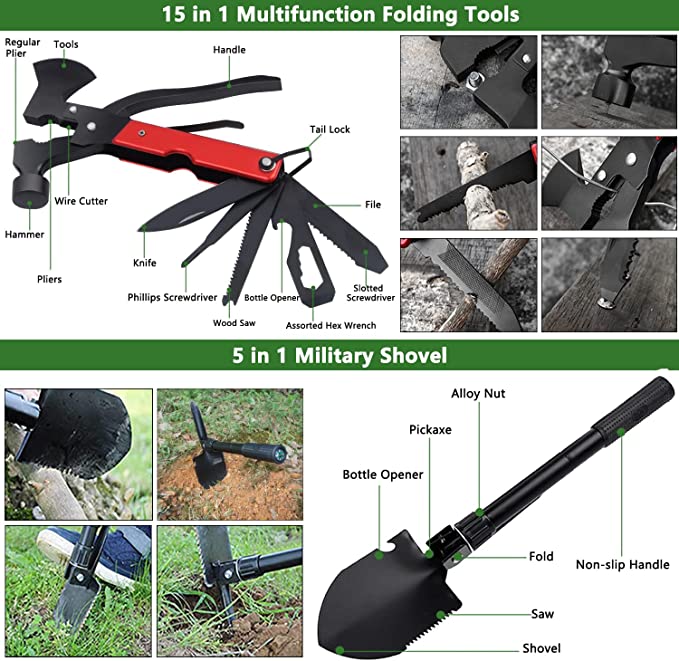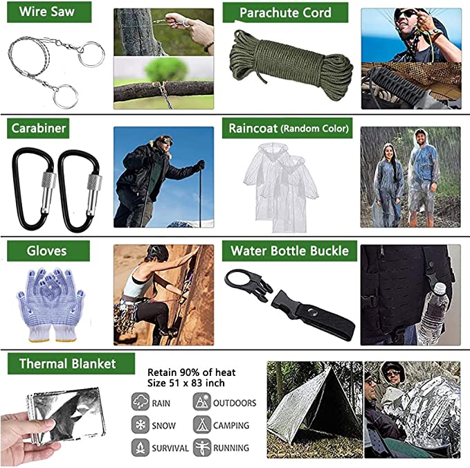 Set di Kit di Sopravvivenza di Alta Qualità: Il kit di sopravvivenza militare contiene:1.torcia elettrica - 2.Pala pieghevole - 3.Multi-strumento 14 in 1 - 4:coltello pieghevole di sopravvivenza (Lunghezza della lama:8.5 cm) - 5 tenda - 6 coperte di salvataggio - 7.Moschettone - 8. impermeabile - 9.fischietto di sopravvivenza - 10.sega a filo - .Il kit di sopravvivenza ha tutto il necessario per rendere più sicuro il tuo viaggio ed è la garanzia di sopravvivenza e salute in natura. Durevole & Conveniente: Resistente e realizzato con materiali di alta qualità, il kit di sopravvivenza di emergenza è stato accuratamente selezionato per garantire un'eccellente funzionalità ed efficienza, puoi usarlo con sicurezza per garantire la tua sicurezza. Leggero e portatile: Il kit di sopravvivenza misura 22x20x13 cm e pesa 1800 g. Facile da trasportare e riporre, è una pratica attrezzatura da campeggio e il kit definitivo che si adatta facilmente allo zaino e all'auto. È essenziale per viaggi, campeggio, escursioni, avventure, disastri, emergenze e lavori di soccorso.
