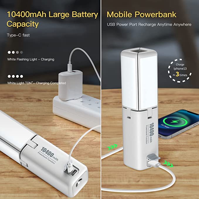 Luminosità massima 750 lumen, 4 lampadine ad angolo regolabile a 90°, puoi cambiare la direzione della luce a piacimento, evitando gli occhi diretti o disturbando gli altri. Espandi/comprimi la lampadina, può essere appesa alla tenda/posizionata sul tavolo. 7 modalità di illuminazione: le luci da campeggio hanno 7 modalità di illuminazione, luce bianca fredda (alta), luce bianca calda (alta), luce bianca calda (media), luce bianca calda (bassa), luce della torcia, SOS, rosso lampeggiante. Una varietà di luci calde con luminosità regolabile proteggono gli occhi, in modo che gli occhi non siano abbaglianti e affaticati per molto tempo. Lampada di Emergenza da 10400 mAh: le luci da campeggio sono ricaricabili, questa lanterna da campeggio ha una batteria integrata di grande capacità per potenziare un telefono, tenendoti al sicuro e in contatto. La funzione power bank ti consente di caricare il tuo cellulare o altri dispositivi USB in situazioni di emergenza. Autonomia massima di 60 ore: questa lampada da campeggio ricaricabile è classificata per durare fino a 60 ore, perfetta per tutti gli scenari interni ed esterni a cui puoi pensare, tra cui: sala studio, cucina, garage, officina, cena, campeggio, picnic ,eccetera - Facile da usare: solo un pulsante per controllare le modalità di illuminazione, espandere o chiudere facilmente la lanterna per passare a qualsiasi condizione. Inoltre, misura solo 56 x 56 x 222 mm e pesa 420 g in modo da poterlo trasportare a mano o appenderlo a qualsiasi gancio che trovi o semplicemente metterlo da parte, il tutto senza sforzo
