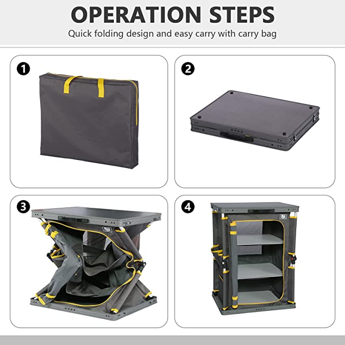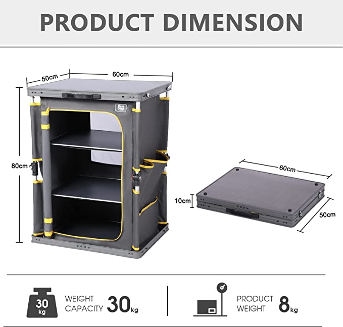 Credenza per cucina in campeggio, misure aperta:60 x 50 x 80 cm, dimensioni da piegata: 60 x 50 x 10 cm. L'armadio da campeggio Timber Ridge è ideale per il giardino, il campeggio. COMODO: Il mobiletto da campeggio Timber Ridge può essere facilmente montato e ripiegato con quattro gambe e questo armadio pieghevole da campeggio ha 3 ripiani. L'armadio pieghevole è realizzato in alluminio e poliestere rivestito e il piccolo armadio da campeggio ha una finestra in rete traspirante. La piastra di copertura è impermeabile e resistente al calore. la capienza è di 8,0 kg, ma può sopportare fino a 30 kg.