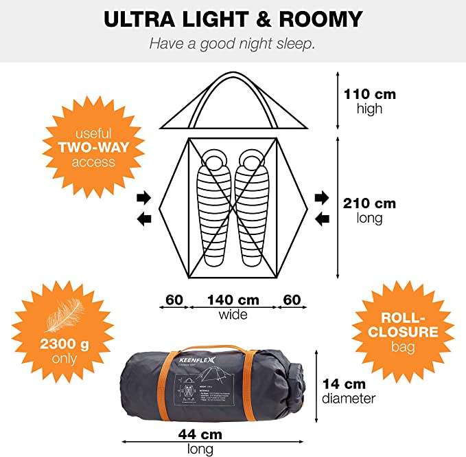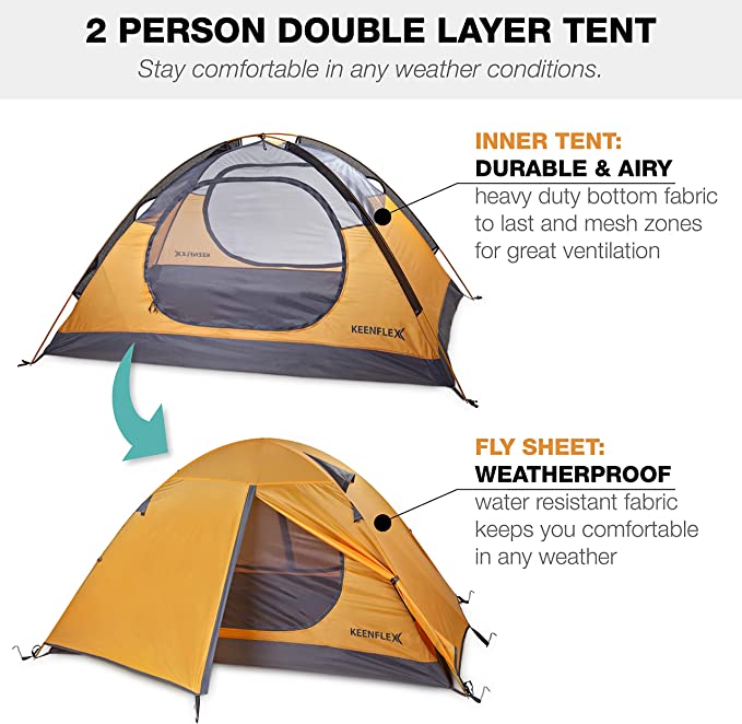 KeenFlex Tenda da Campeggio per 2 Persone - Doppio Strato Ultra Leggera - Impermeabile - Marchio KeenFlex - Capienza 2 persone - Materiale Alluminio - La struttura a doppio strato spazza via la condensa tenendoti all'asciutto anche durante le piogge più intense. In più è conveniente, così non dovrai scegliere tra comfort e risparmio. Resistente All'acqua - Offre una resistenza all'acqua di 3000 mm (tetto) e di 5000 mm (pavimento), proprio come le migliori tende. Con questo livello di impermeabilità potrai permetterti di sfidare le previsioni meteo tutto l'anno, ma senza spendere un capitale. Leggera e Robusta - Attraverso una combinazione di struttura in alluminio e materiali ultra leggeri, la tenda da campeggio per due persone e completamente impermeabile e a doppio strato e pesa solo 2.1 kg - Si Monta In Pochi Minuti - Pensata per due persone - Con accesso facilitato, ottima ventilazione e scomparti separati per ogni campeggiatore (sufficienti per zaino, stivali ecc.)