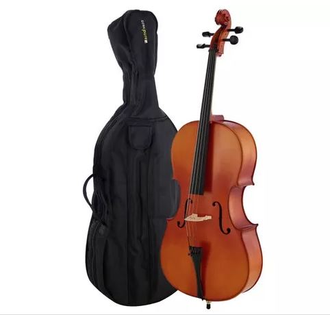 VIOLONCELLO 4/4 IN LEGNO MASSELLO - Un violoncello 4/4 perfetto per studenti e musicisti professionisti. Costruito con materiali di alta qualità, realizzato secondo le specifiche tecniche degli strumenti professionali dei mastri liutai italiani, offre un suono ricco e bilanciato. Caratteristiche: Fondo e fasce in Acero massello - Top in abete massello -Tastiera in ebano -Corde Crown - Archetto ottagonale con nasetto in ebano e crini naturali - Include custodia morbida per violoncello con maniglie e cinghie - Made in Europe - Vernice marrone/rosso scuro - Include custodia morbida per violoncello con maniglie e cinghie, colofonia - Finitura semilucida