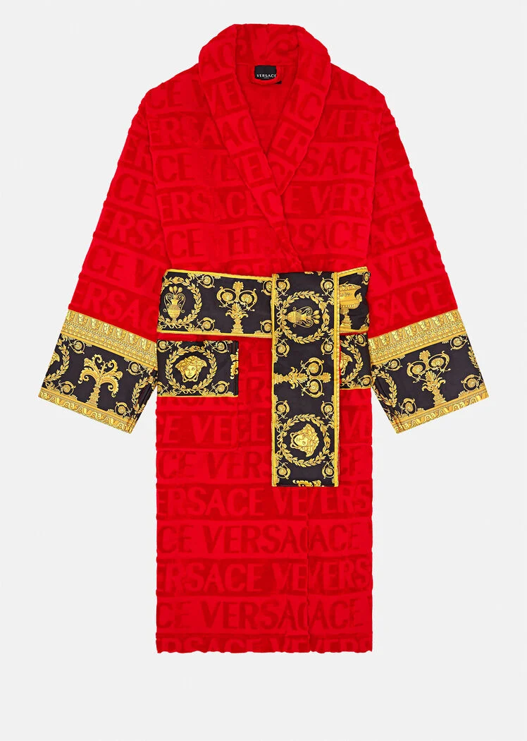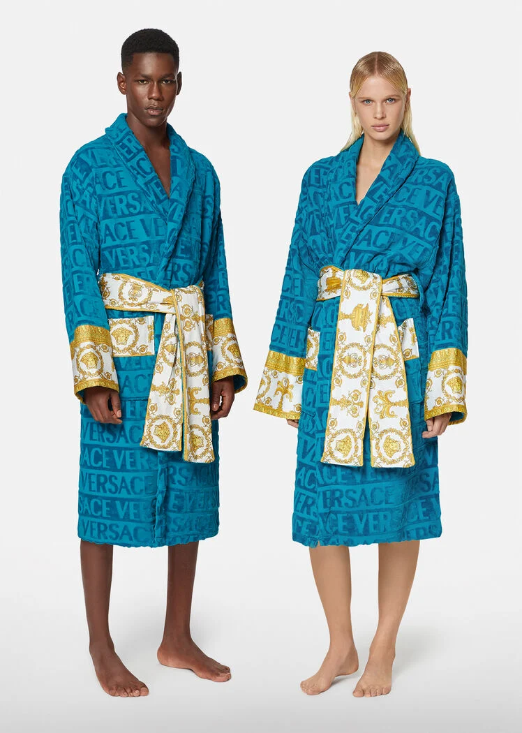 Da Versace jacquard, questo accappatoio in spugna di cotone tono su tono è sottolineato dalla distintiva stampa Barocco su maniche e cintura self-tie. Ogni applicazione è cucita a mano sull'accappatoio dai nostri abili sarti per garantire la migliore qualità - Stampa con logo - Stampa Barocco - Collo sciallato - Tasche frontali applicate - Cintura self-tie - Tessuto esterno: 100% cotone - Lavare in lavatrice a 30 °C - Lavare con detergente privo di cloro - Non candeggiare - Stirare con ferro tiepido - Lavaggio a secco delicato
